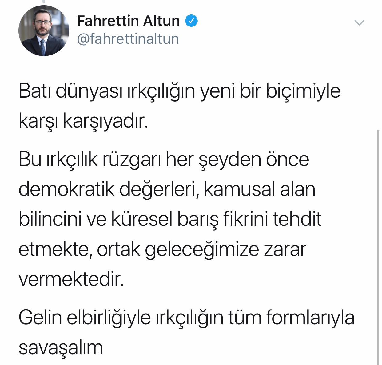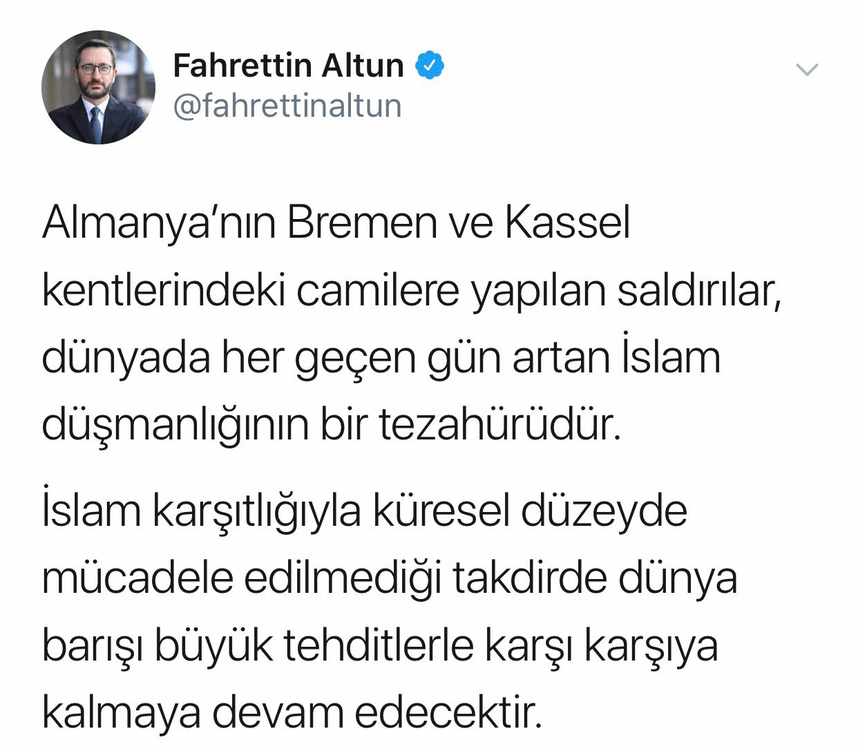 Cumhurbaşkanlığı İletişim Başkanı Prof. Dr. Fahrettin Altun, Almanya'nın Bremen ve Kassel kentlerinde camilere yapılan saldırıların, dünyada her geçen gün artan İslam düşmanlığının bir tezahürü olduğunu belirterek, "İslam karşıtlığıyla küresel düzeyde mücadele edilmediği takdirde dünya barışı büyük tehditlerle karşı karşıya kalmaya devam edecektir." değerlendirmesinde bulundu.