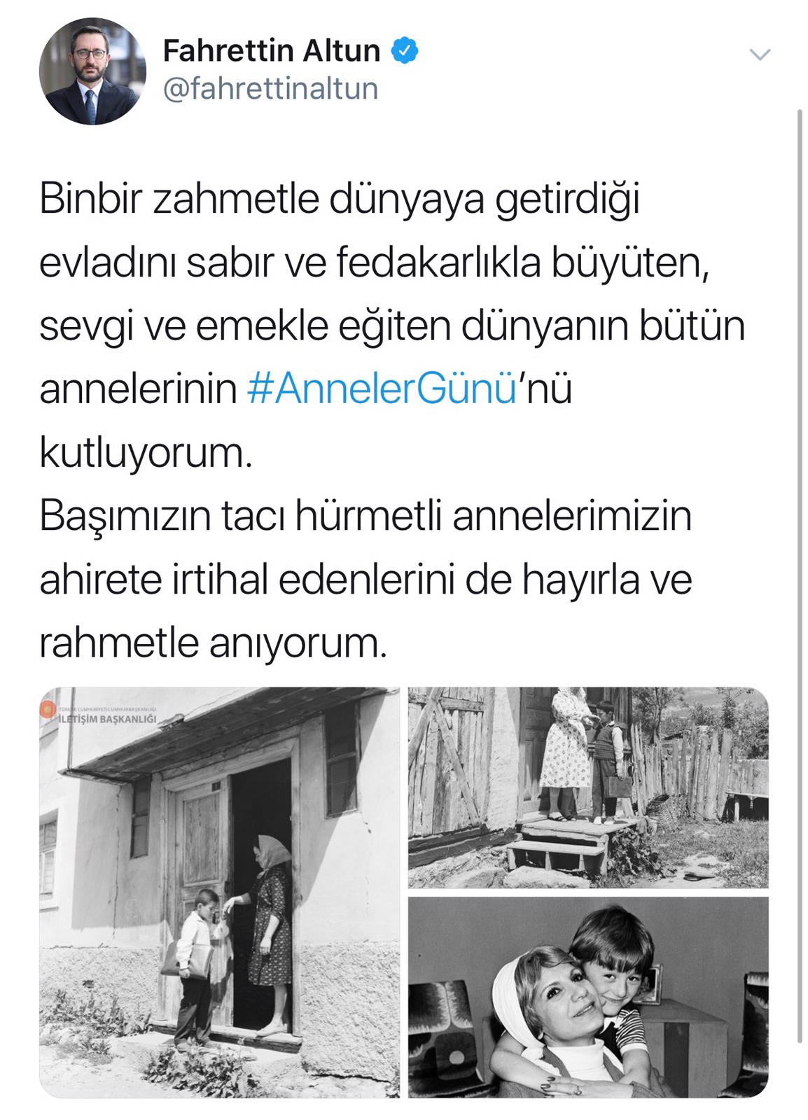 Cumhurbaşkanlığı İletişim Başkanı Prof. Dr. Fahrettin Altun, Anneler Günü münasebetiyle Twitter hesabı üzerinden bir mesaj yayınladı.