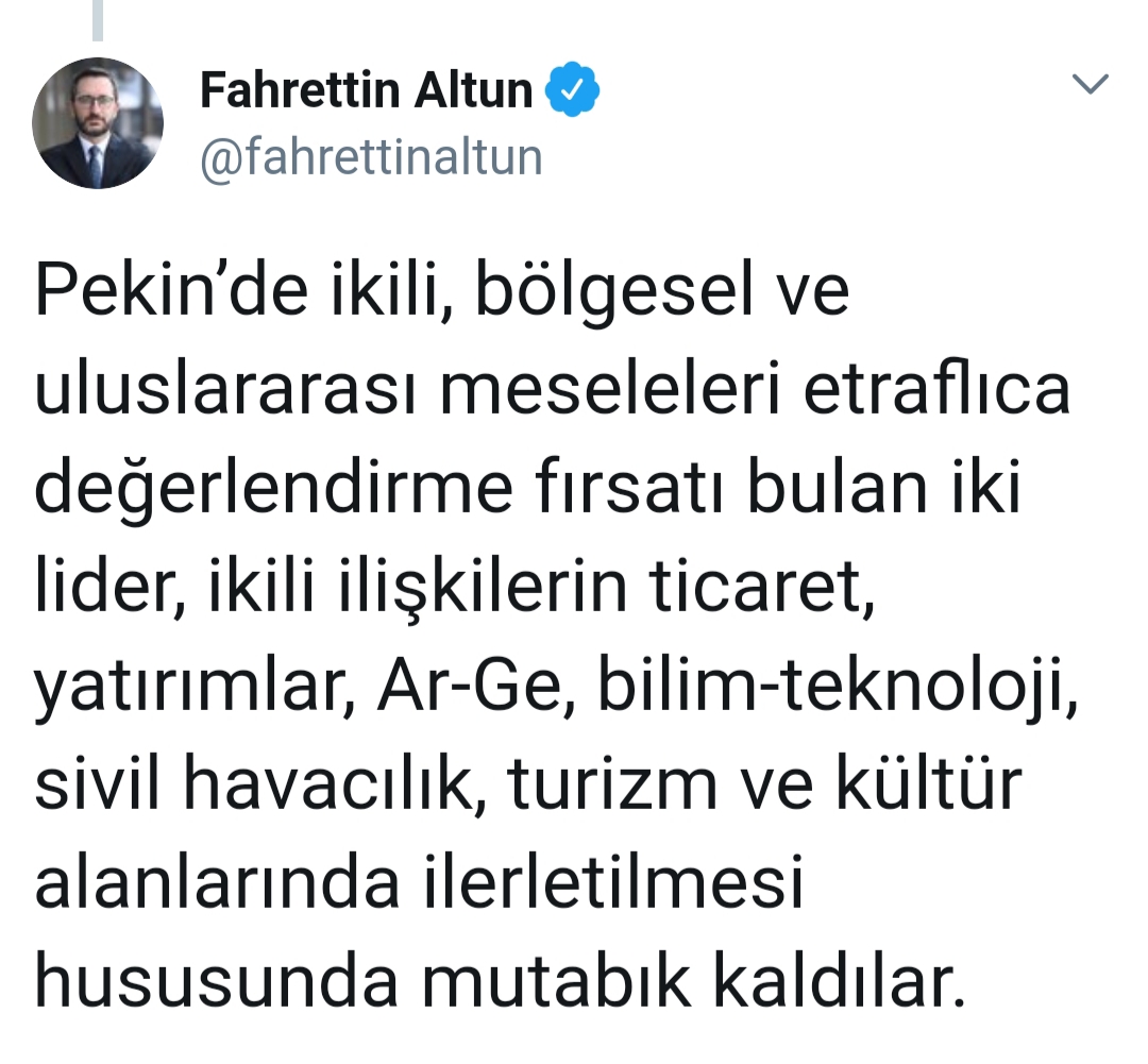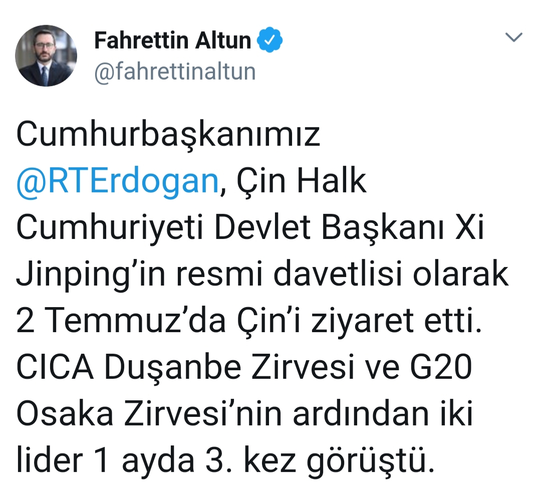 Altun, Twitter hesabından yaptığı paylaşımda, Cumhurbaşkanı Erdoğan'ın, Çin Halk Cumhuriyeti Devlet Başkanı Şi'nin resmi davetlisi olarak dün Çin'i ziyaret ettiğini, CICA Duşanbe Zirvesi ve G20 Osaka Zirvesi'nin ardından iki liderin bir ayda üçüncü kez görüştüğünü belirtti.
