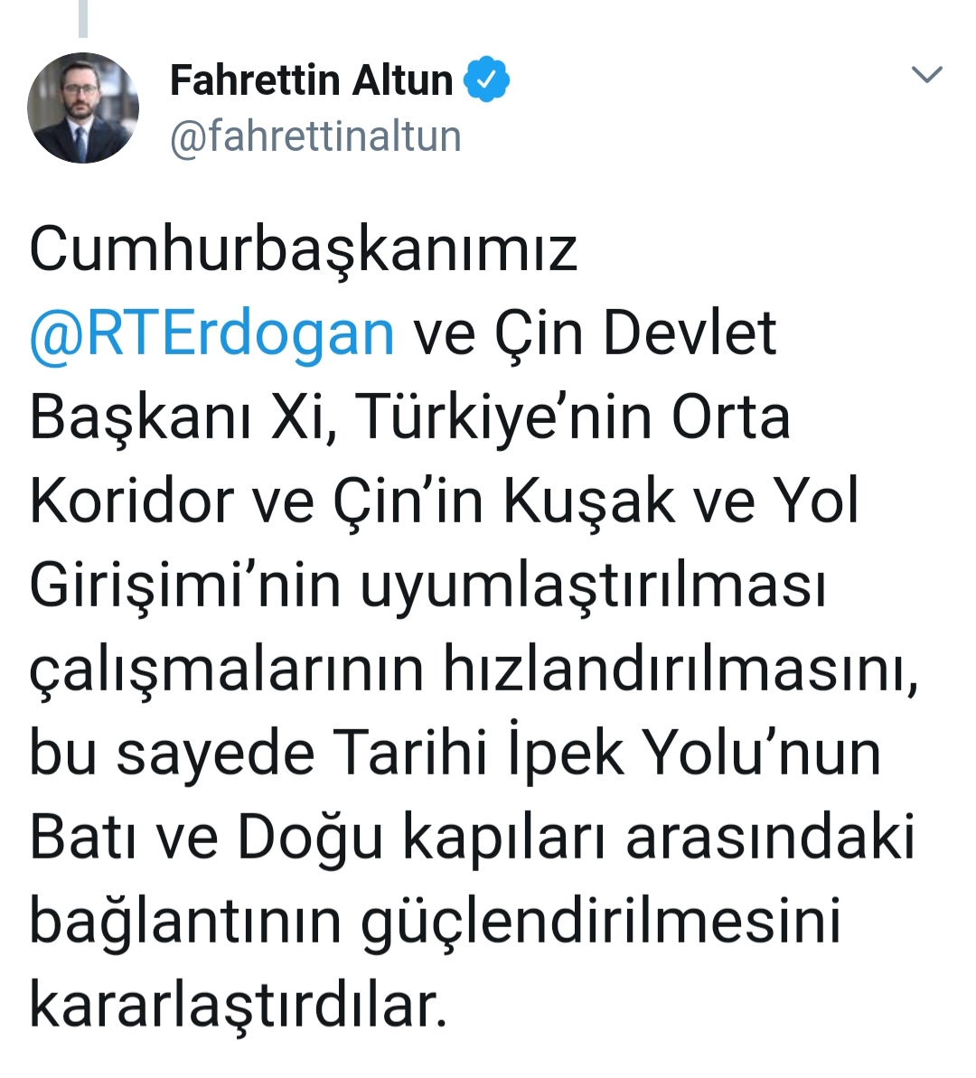 Cumhurbaşkanlığı İletişim Başkanı Prof. Dr. Fahrettin Altun, Cumhurbaşkanı Recep Tayyip Erdoğan ve Çin Halk Cumhuriyeti Devlet Başkanı Şi Cinping'in, Türkiye'nin "Orta Koridor" ve Çin'in "Kuşak ve Yol Girişimi"nin uyumlaştırılması çalışmalarının hızlandırılmasını, bu sayede Tarihi İpek Yolu'nun batı ve doğu kapıları arasındaki bağlantının güçlendirilmesini kararlaştırdıklarını bildirdi.