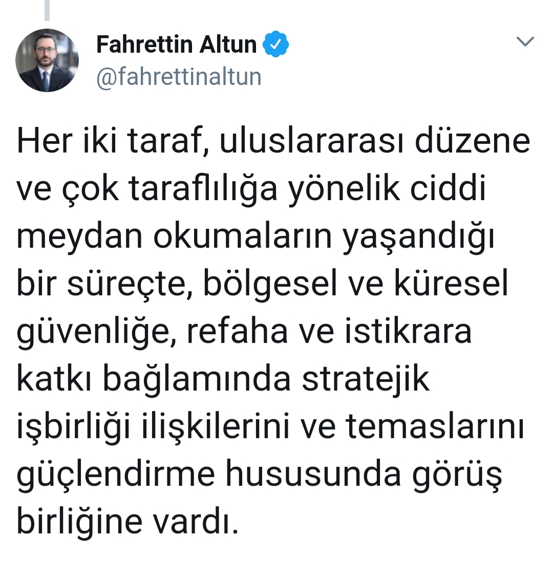 Her iki taraf, uluslararası düzene ve çok taraflılığa yönelik ciddi meydan okumaların yaşandığı bir süreçte, bölgesel ve küresel güvenliğe, refaha ve istikrara katkı bağlamında stratejik işbirliği ilişkilerini ve temaslarını güçlendirme hususunda görüş birliğine vardı.