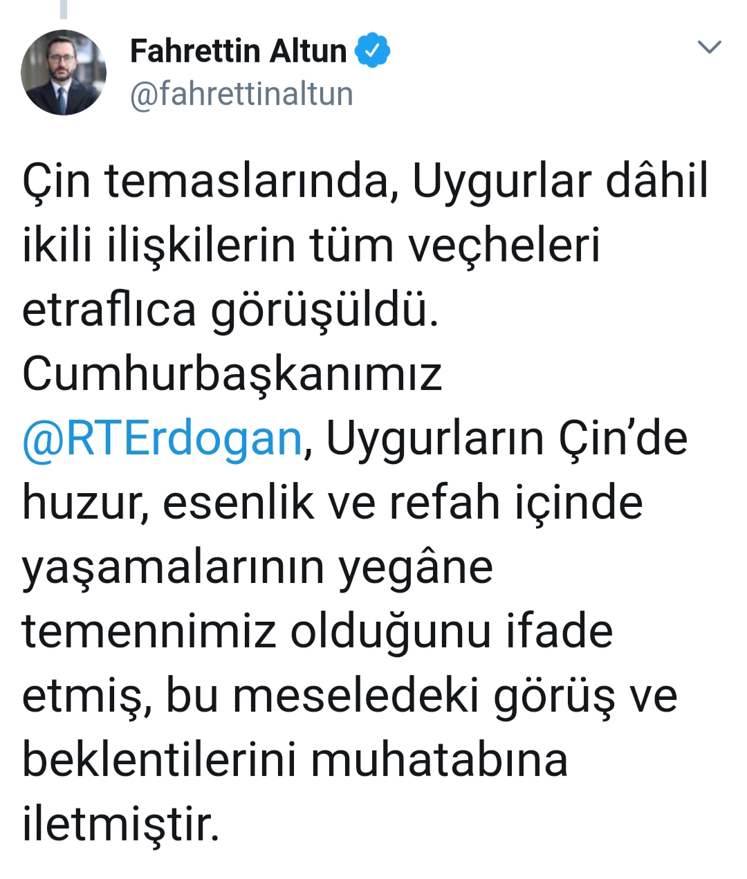 Çin temaslarında, Uygurlar dahil ikili ilişkilerin tüm veçheleri etraflıca görüşüldü. Cumhurbaşkanımız Erdoğan, Uygurların Çin'de huzur, esenlik ve refah içinde yaşamalarının yegane temennimiz olduğunu ifade etmiş, bu meseledeki görüş ve beklentilerini muhatabına iletmiştir.