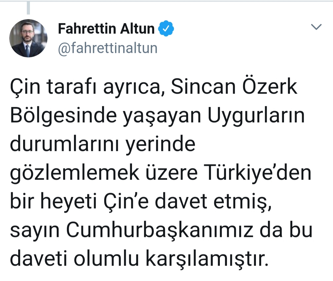 Çin tarafı ayrıca, Sincan Özerk Bölgesi'nde yaşayan Uygurların durumlarını yerinde gözlemlemek üzere Türkiye'den bir heyeti Çin'e davet etmiş, sayın Cumhurbaşkanımız da bu daveti olumlu karşılamıştır."