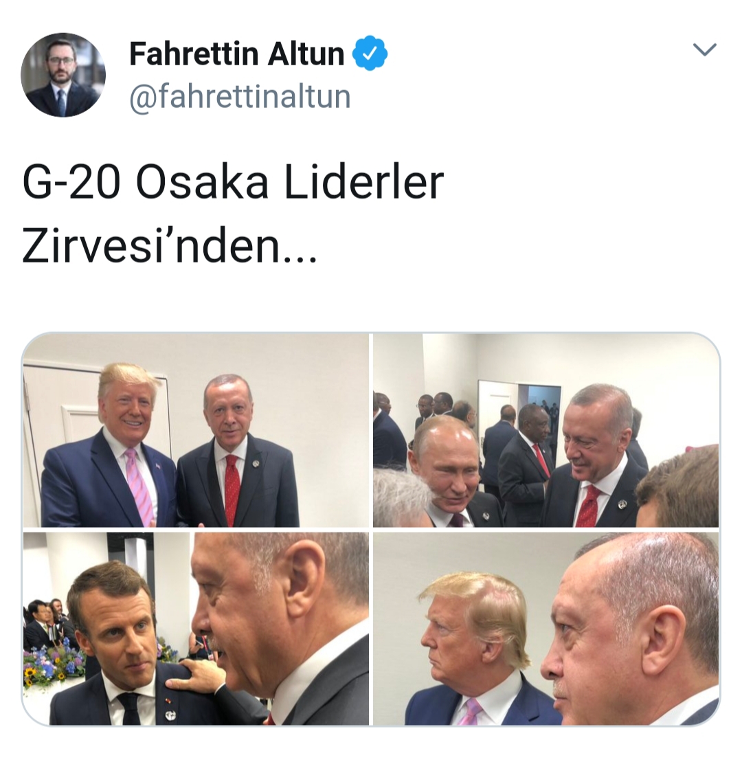 "G-20 Osaka Liderler Zirvesi’nden" başlığıyla yaptığı paylaşımında Altun, Cumhurbaşkanı Erdoğan'ın ABD Başkanı Donald Trump, Rusya Devlet Başkanı Vladimir Putin, Fransa Cumhurbaşkanı Emmanuel Macron ile ayaküstü yaptığı sohbetlere ilişkin fotoğraf karelerine yer verdi.