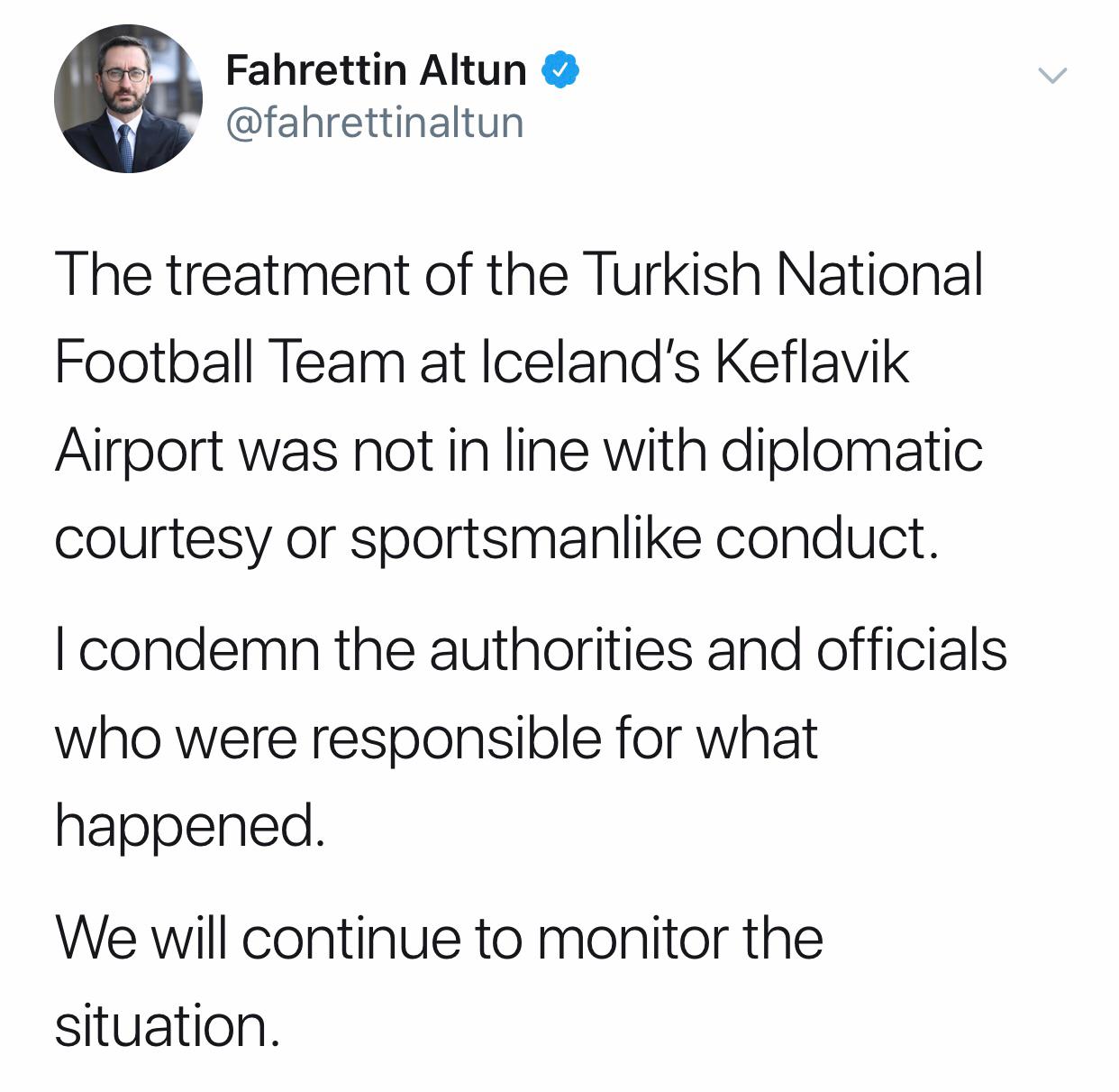 Altun, Twitter hesabından, "A Milli Futbol Takımı'nın İzlanda'da Keflavik Havalimanı'nda maruz kaldığı muamele diplomatik nezakete ve sportmenliğe uygun değildi. Olanlardan sorumlu tüm yetkilileri ve görevlileri kınıyorum." değerlendirmesinde bulundu.