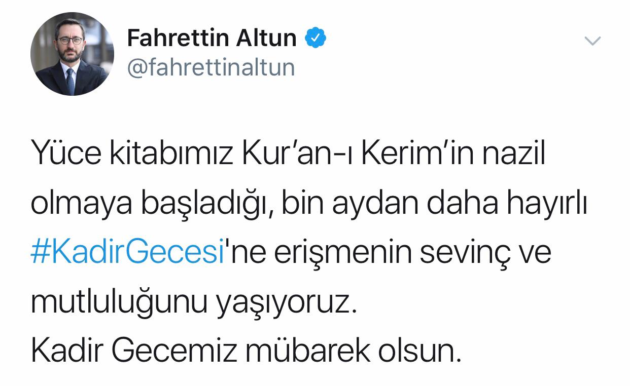 Altun paylaşımında "Yüce kitabımız Kur'an-ı Kerim'in nazil olmaya başladığı, bin aydan daha hayırlı Kadir Gecesi'ne erişmenin sevinç ve mutluluğunu yaşıyoruz. Kadir Gecemiz mübarek olsun." ifadelerini kullandı.