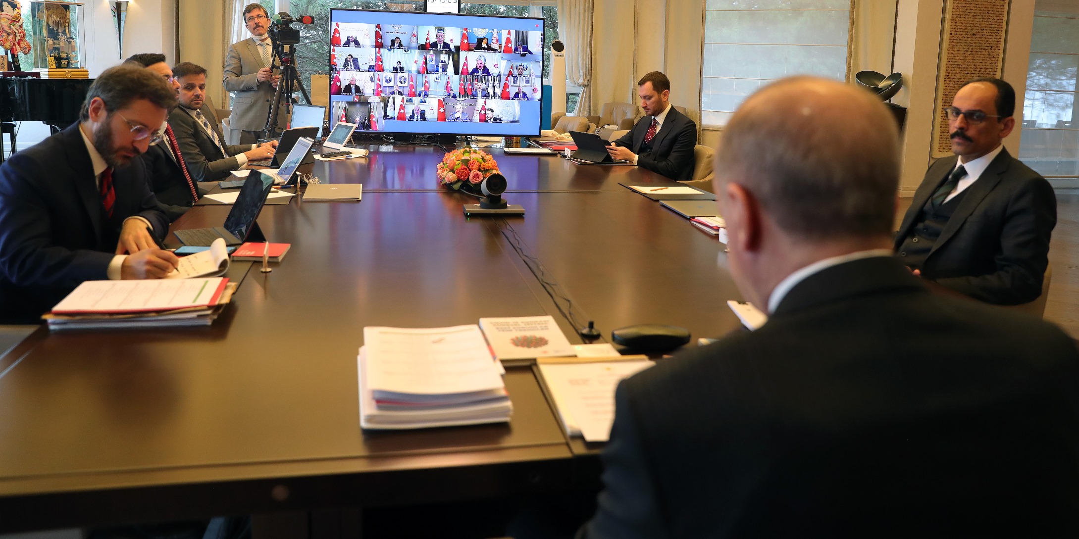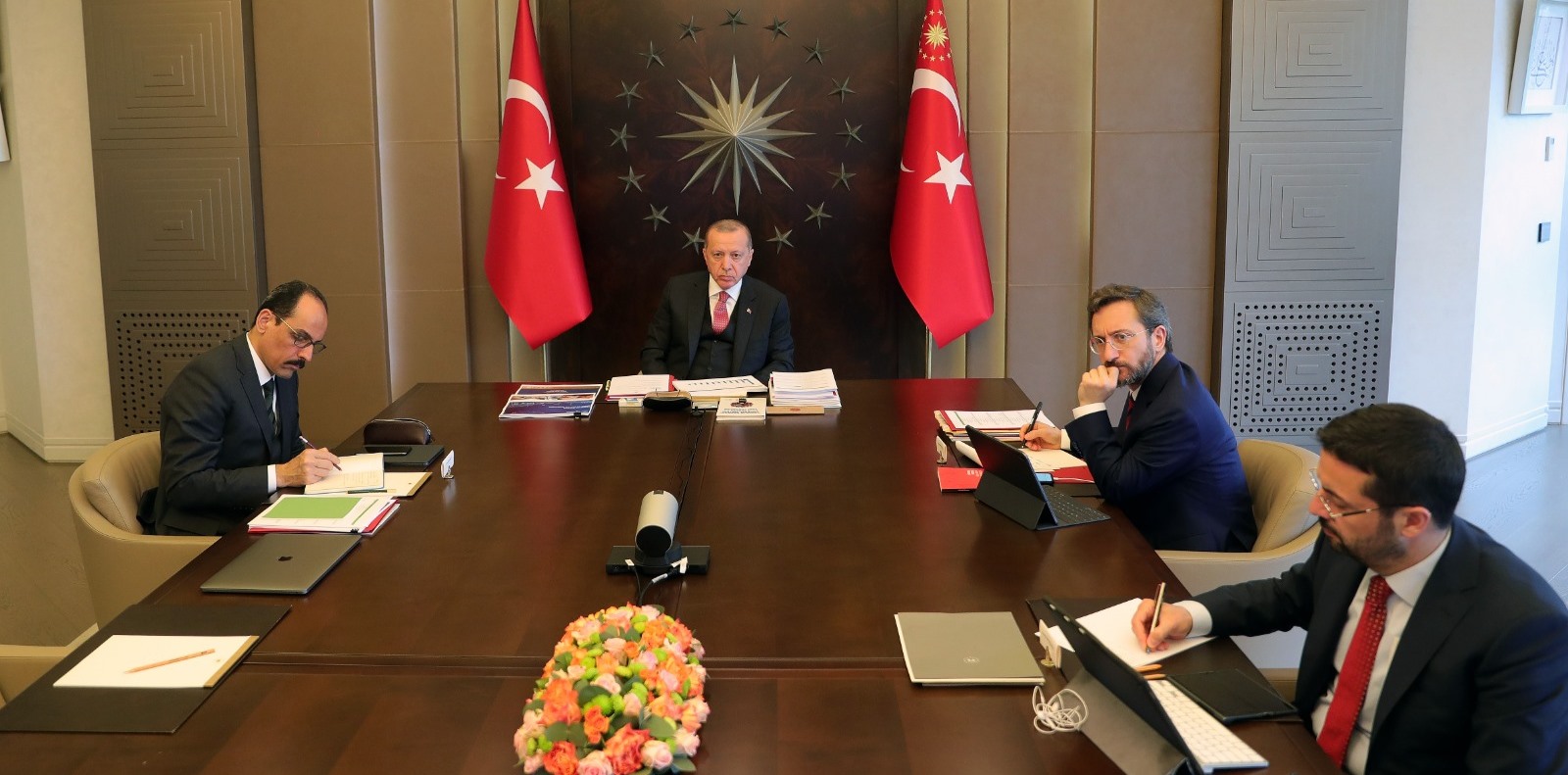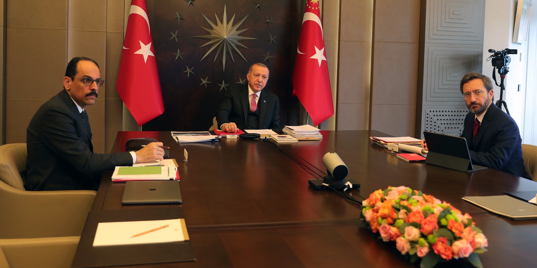 Koronavirüs salgını sebebiyle altıncı kez video konferans yöntemiyle yapılan toplantıda, İletişim Başkanı Fahrettin Altun ve Cumhurbaşkanlığı Sözcüsü İbrahim Kalın da yer aldı.