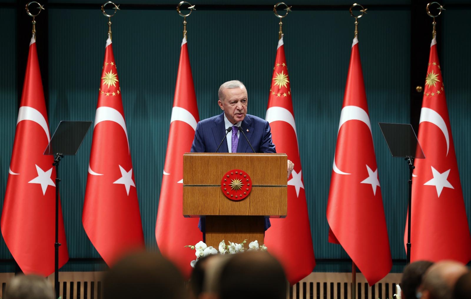 Cumhurbaşkanı Erdoğan Kabine Toplantısı'nın ardından millete seslendi. Vatandaşlara ve Türkiye'nin gönül coğrafyasındaki tüm Türkiye sevdalılarına selamlarını ileterek konuşmasına başlayan Cumhurbaşkanı Erdoğan, milletin "Kızılelma"sına dönüşen Türkiye Yüzyılı'nın inşası yolunda azim ve sabırla ilerlediklerini belirtti.