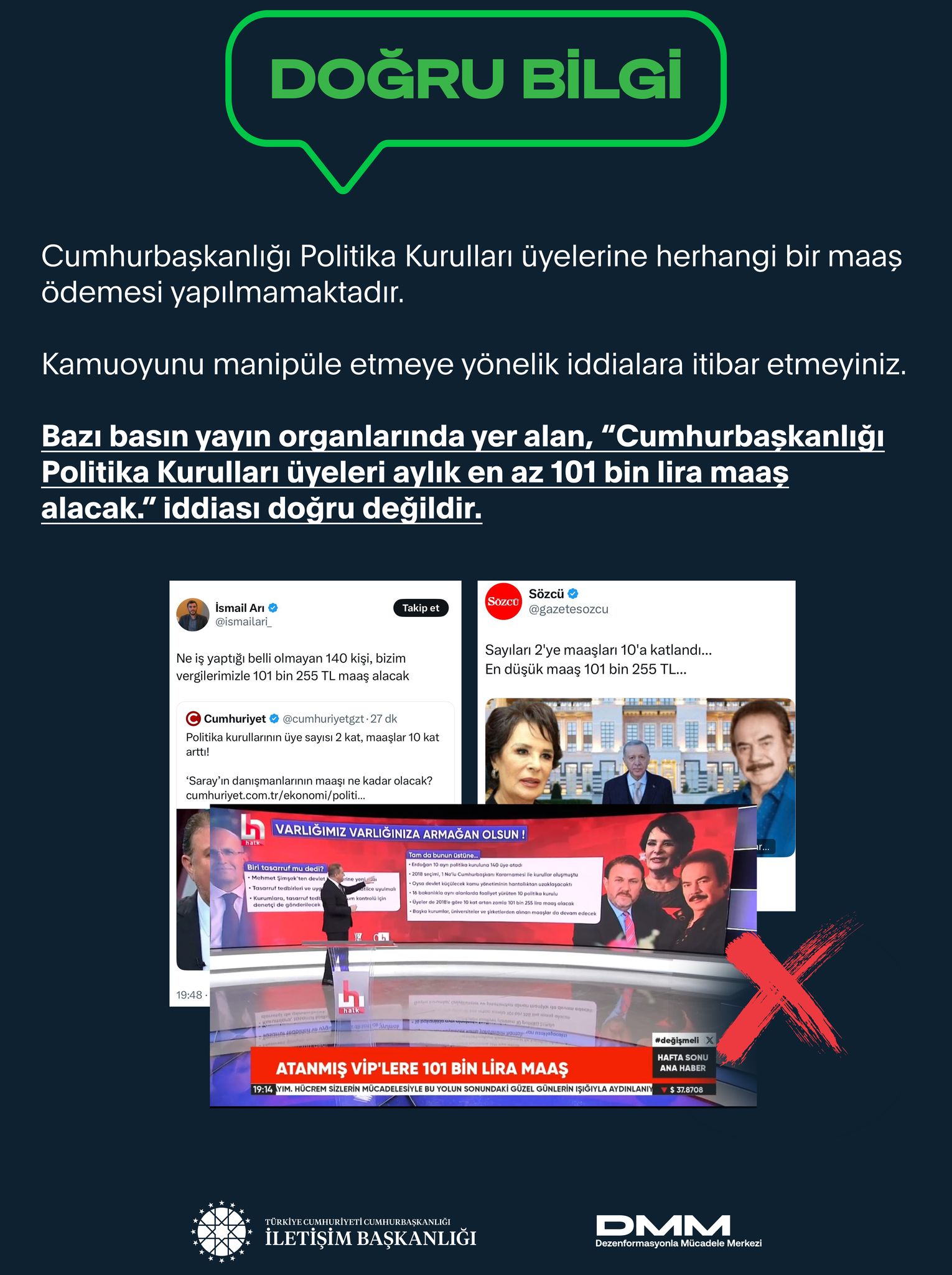 Bazı basın yayın organlarında yer alan, “Cumhurbaşkanlığı Politika Kurulları üyeleri aylık en az 101 bin lira maaş alacak.” iddiası doğru değildir.