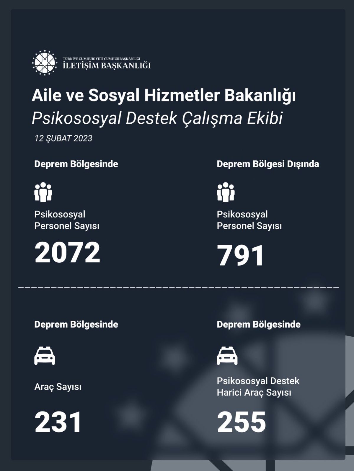 Aile ve Sosyal Hizmetler Bakanlığı, deprem bölgesinde 2 bin 72, deprem bölgesi dışında 791 psikososyal personeli ile hizmet vermektedir. Bölgede psikososyal destek amaçlı 231 araç ve bunun dışında da 255 araç hizmet vermektedir.