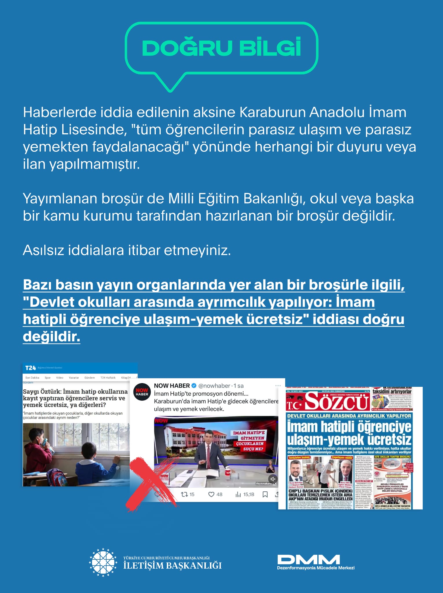Haberlerde iddia edilenin aksine Karaburun Anadolu İmam Hatip Lisesinde, "tüm öğrencilerin parasız ulaşım ve parasız yemekten faydalanacağı" yönünde herhangi bir duyuru veya ilan yapılmamıştır. Yayımlanan broşür de Millî Eğitim Bakanlığı, okul veya başka bir kamu kurumu tarafından hazırlanan bir broşür değildir.