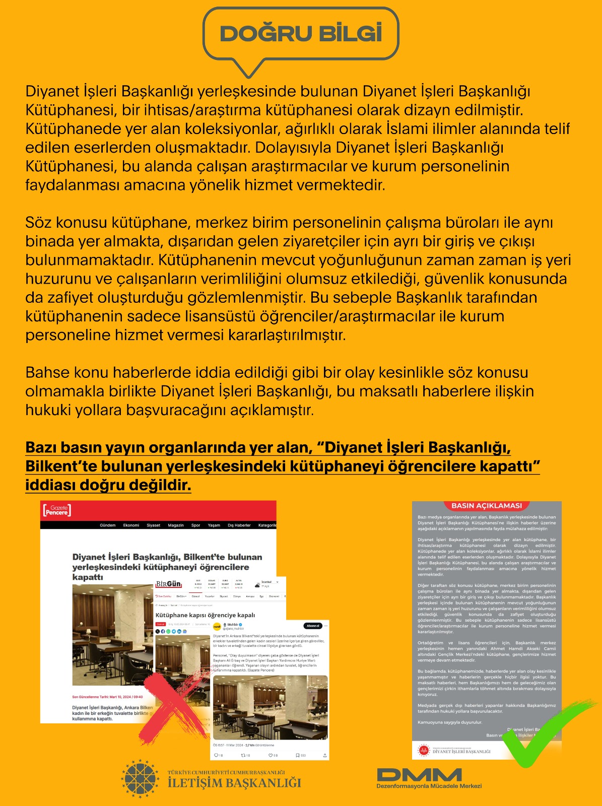 Bazı basın yayın organlarında yer alan, “Diyanet İşleri Başkanlığı, Bilkent’te bulunan yerleşkesindeki kütüphaneyi öğrencilere kapattı” iddiası doğru değildir.