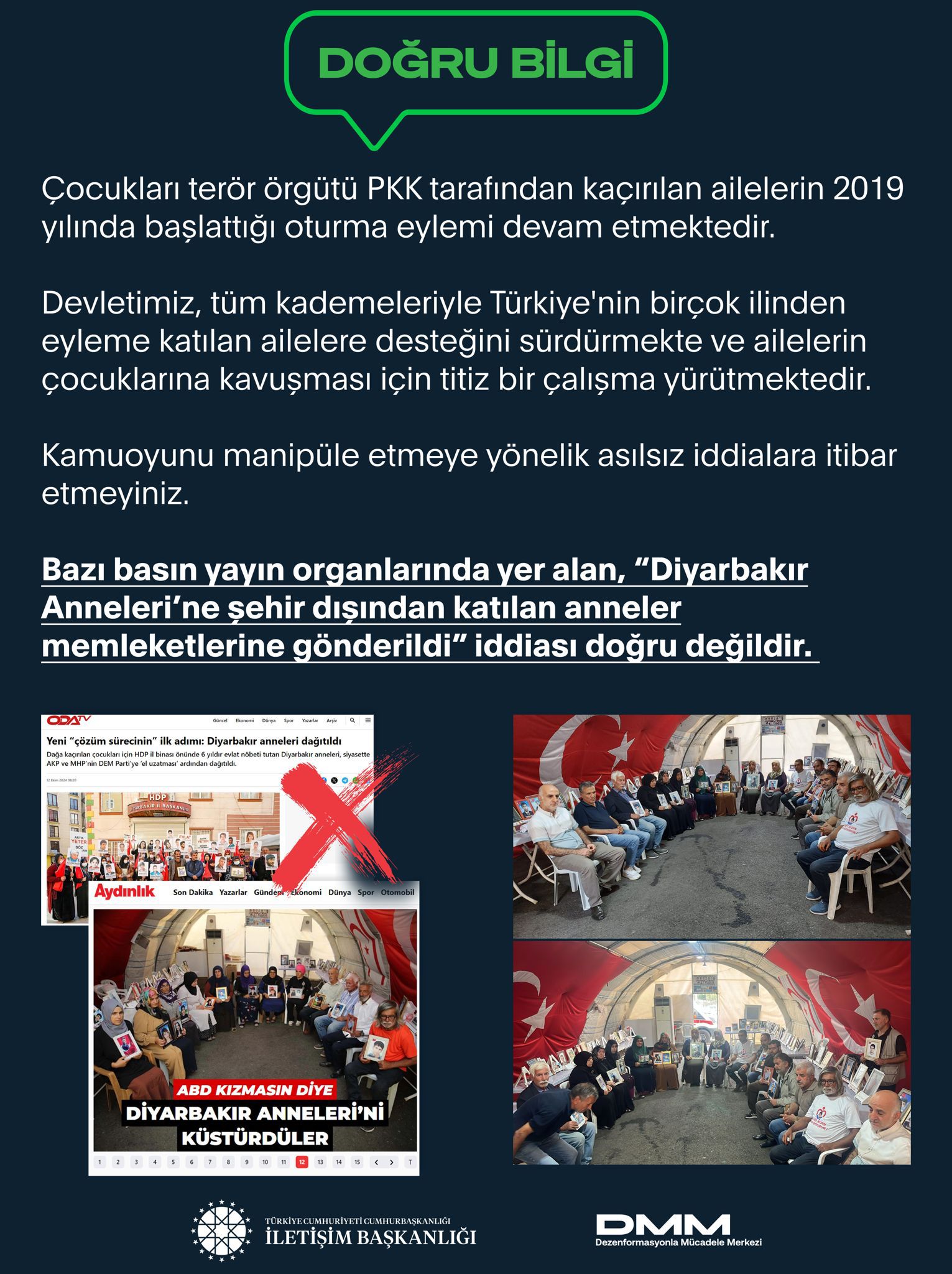 Bazı basın yayın organlarında yer alan, “Diyarbakır Anneleri’ne şehir dışından katılan anneler memleketlerine gönderildi” iddiası doğru değildir.