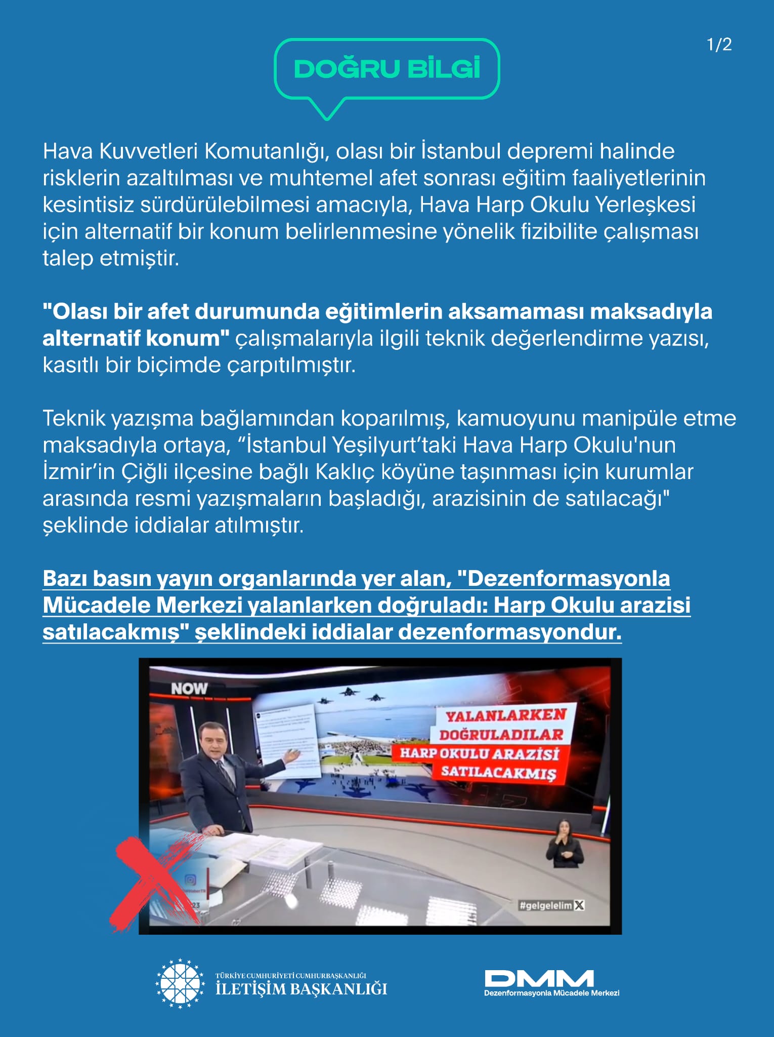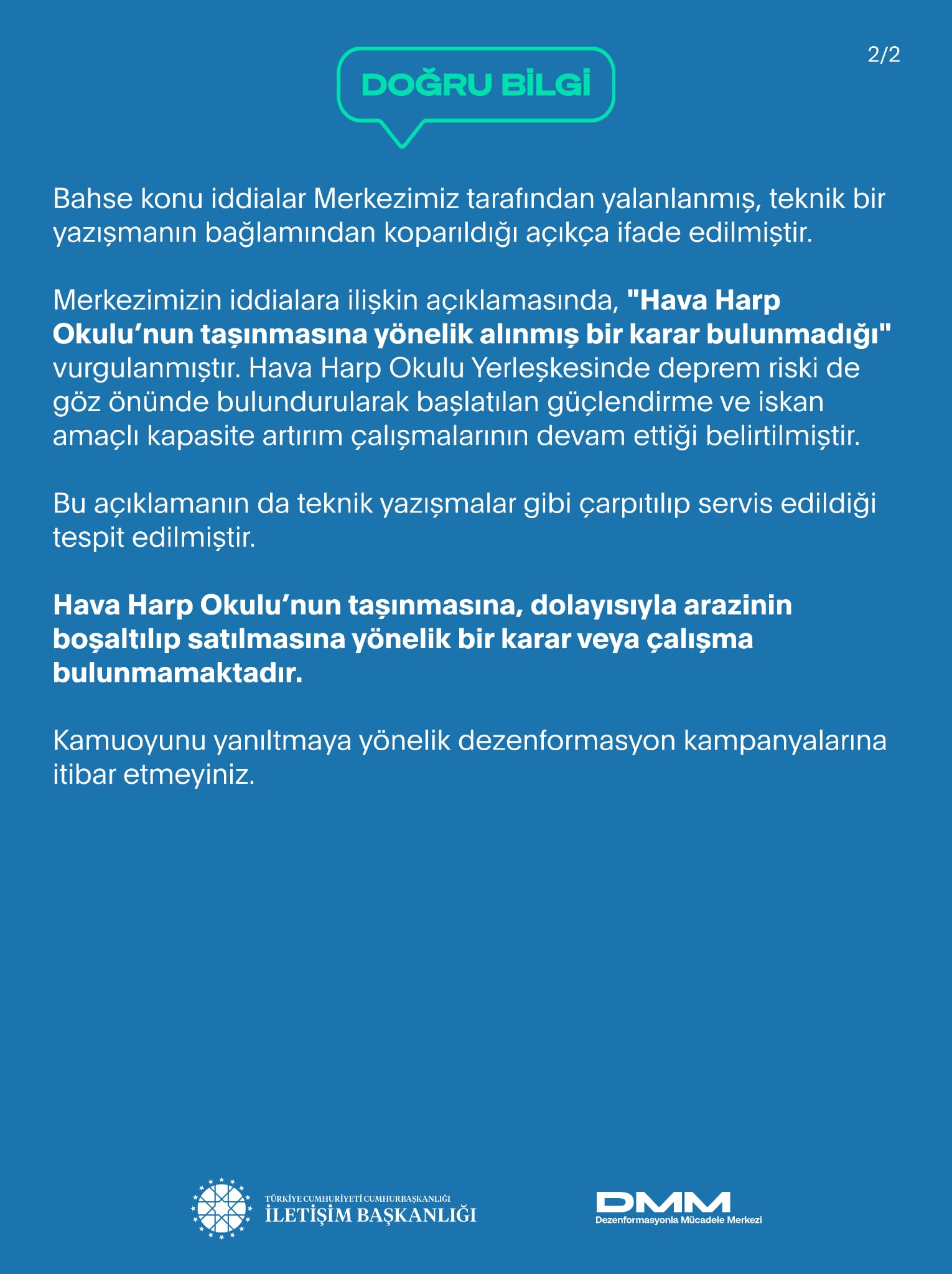 Bazı basın yayın organlarında yer alan, "Dezenformasyonla Mücadele Merkezi yalanlarken doğruladı: Harp Okulu arazisi satılacakmış" şeklindeki iddialar dezenformasyondur.
