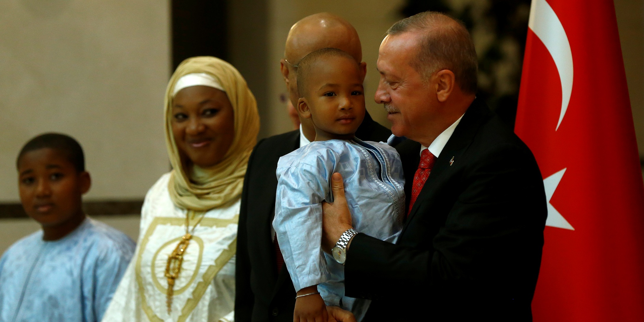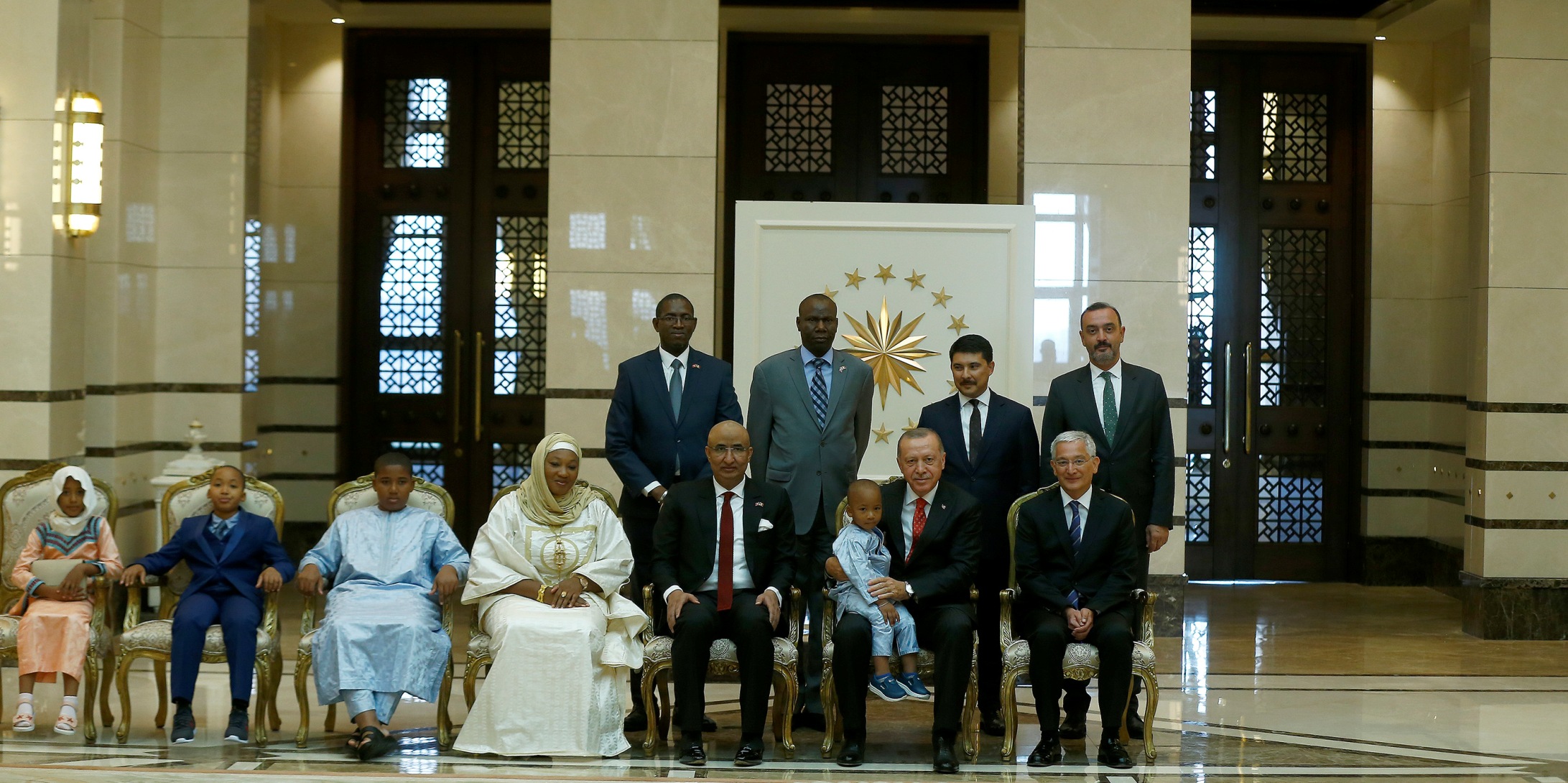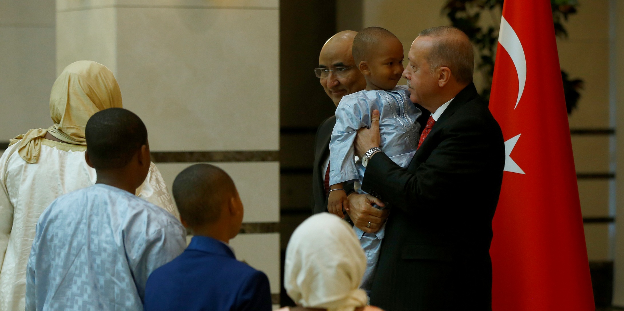 Cumhurbaşkanı Erdoğan, takdim sırasında Büyükelçi İbrahim'in 4 çocuğundan en küçüğü olan 4 yaşındaki Amadou Ag Muhammed Ali'yi kucağına alarak bir süre sohbet etti.