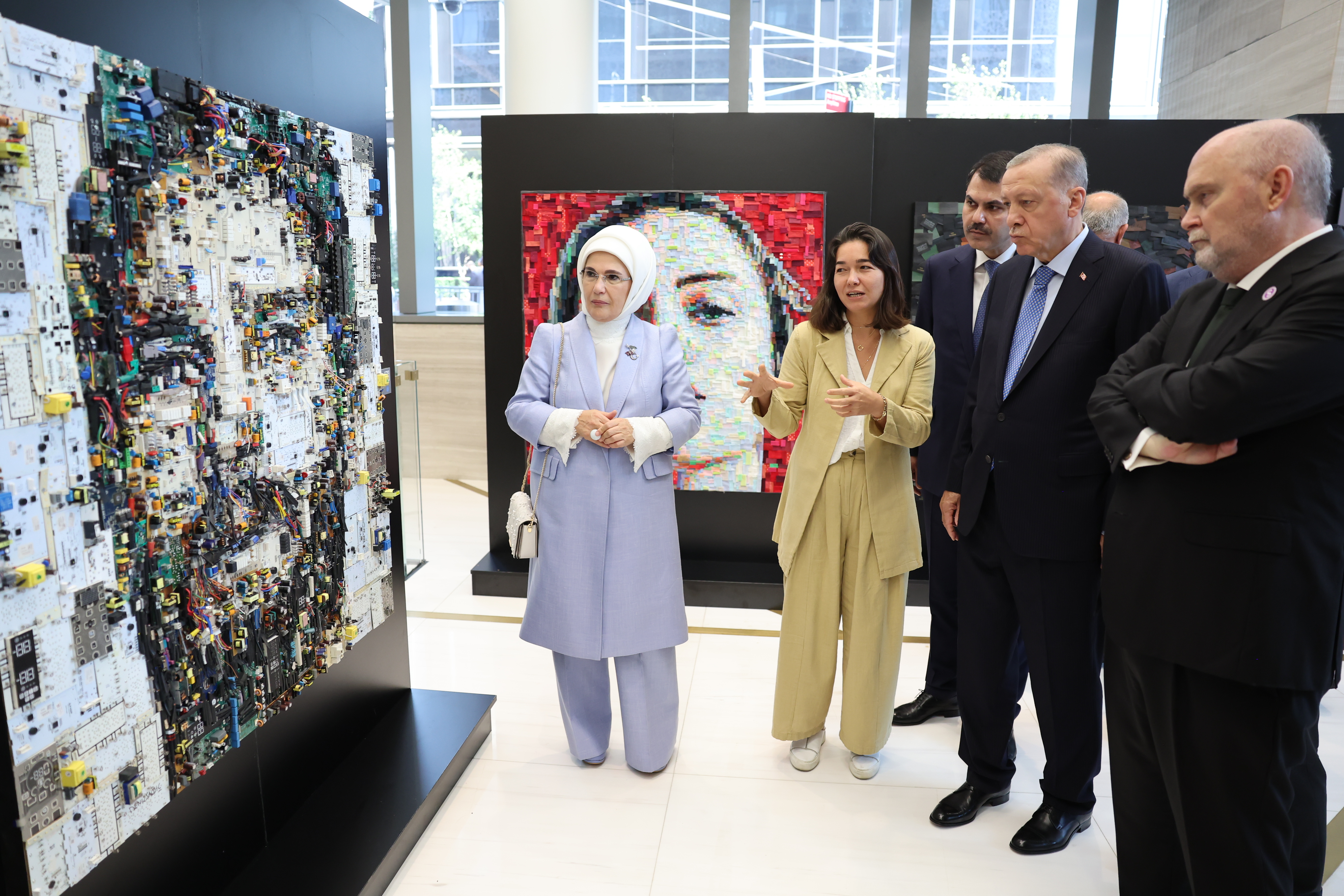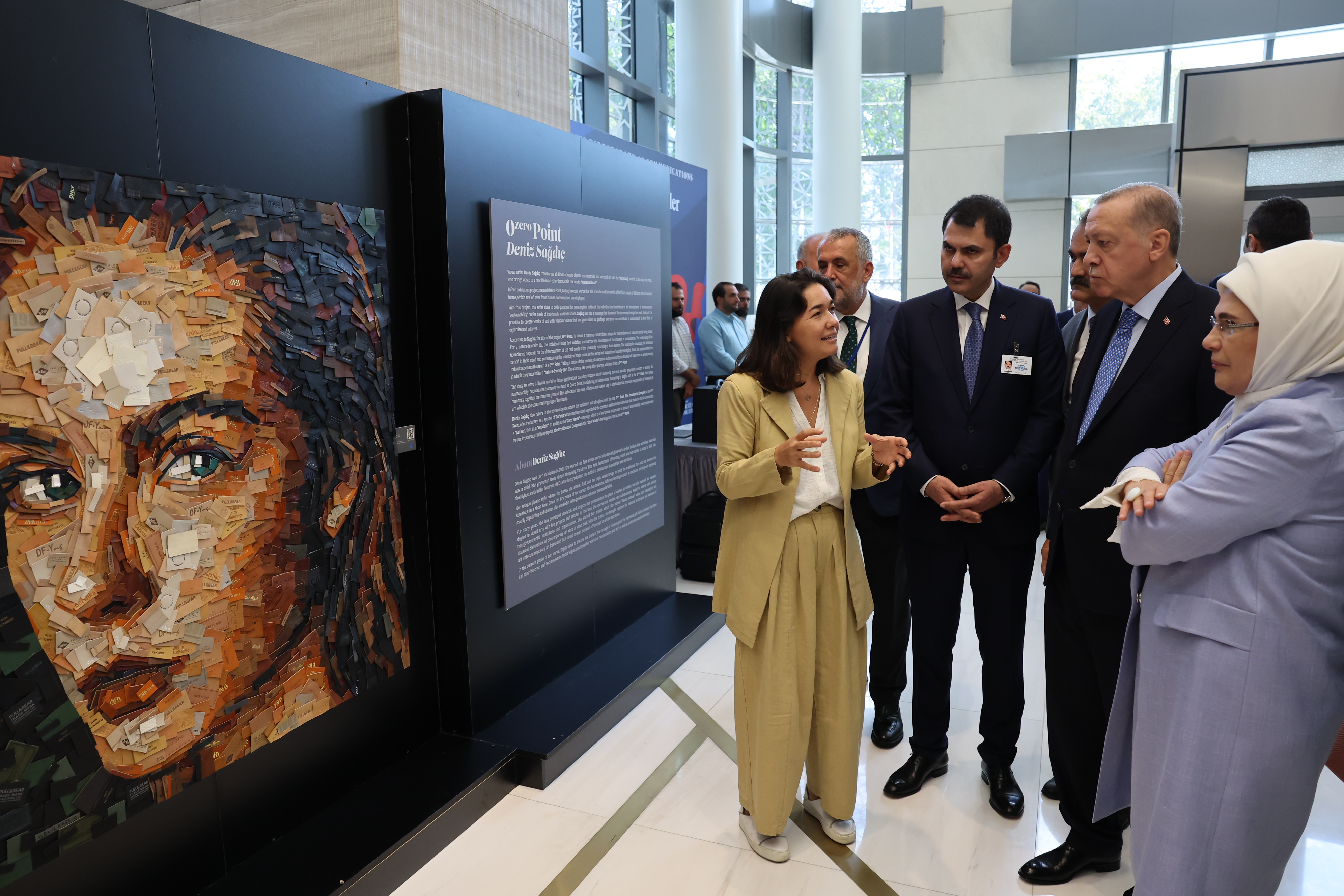 Sanatçı Deniz Sağdıç'tan eserler hakkında bilgi alan Cumhurbaşkanı Erdoğan, pil, ilaç, plastik, tekstil, şişe kapakları ve elektronik eşya gibi çok farklı atıklardan tasarlanan tabloları etkileyici bulduğunu söyledi. Cumhurbaşkanı Erdoğan, sanatçıya yürüttüğü çevreci çalışmalarında başarı diledi.
