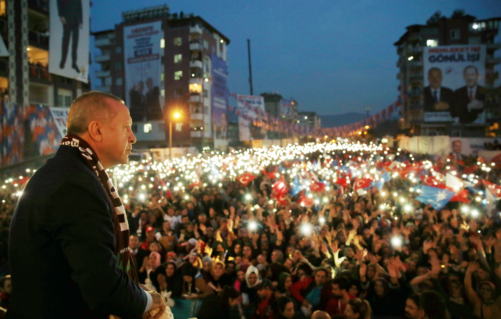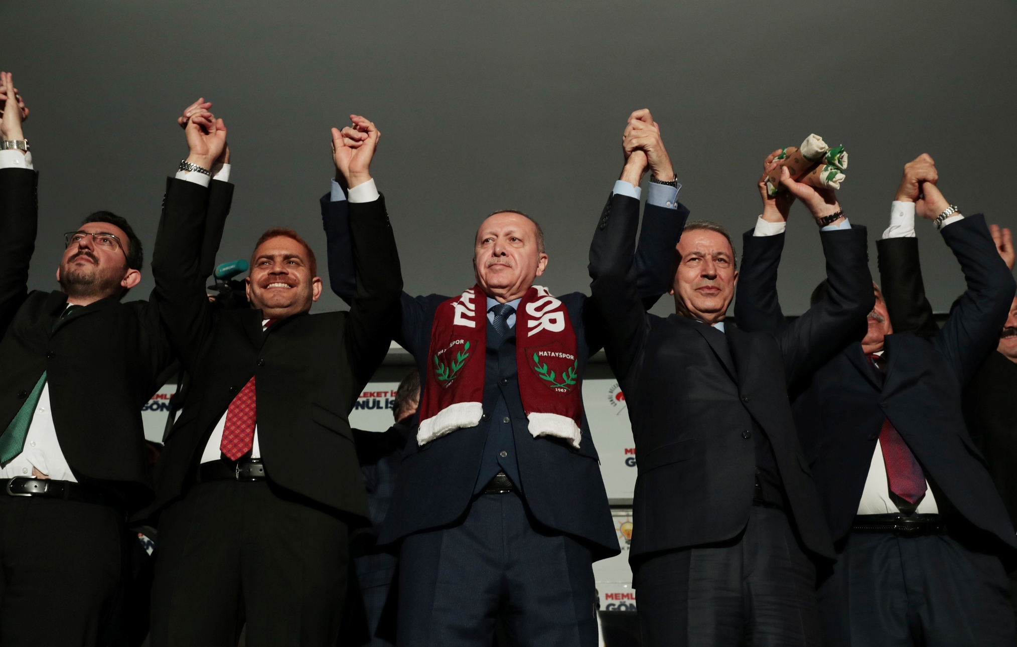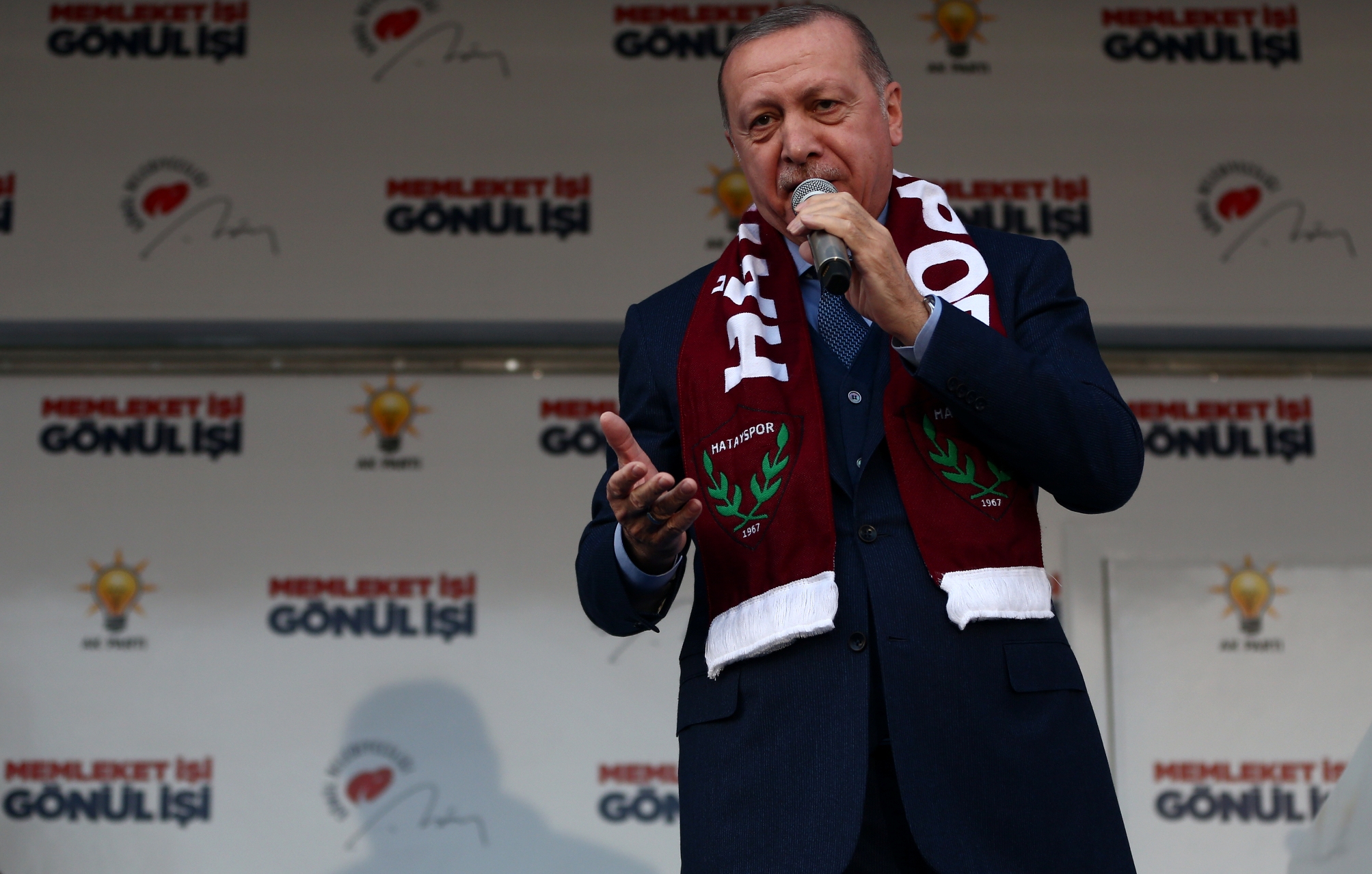 Erdoğan, "Hatay, 31 Mart'ta sandığa, demokrasiye, milli iradeye sahip çıkıyor musun, Cumhur İttifakı'na sahip çıkıyor musun, tevazu, samimiyet ve gayretle memleket işi gönül işi diyor musun, mührü gönül belediyeciliğine vuruyor musun?" sorularına, alandakilerin hep bir ağızdan verdiği "Evet" yanıtının ardından, "31 Mart zaferimiz şimdiden kutlu olsun, mübarek olsun. Rabbim hepinizden razı olsun." diye konuştu.