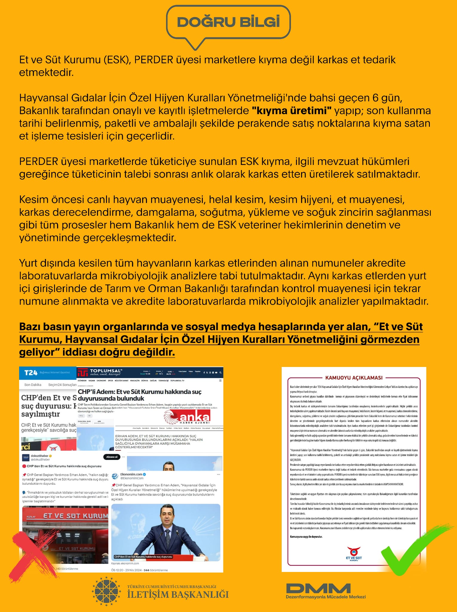 Bazı basın yayın organlarında ve sosyal medya hesaplarında yer alan, “Et ve Süt Kurumu, Hayvansal Gıdalar İçin Özel Hijyen Kuralları Yönetmeliğini görmezden geliyor” iddiası doğru değildir.