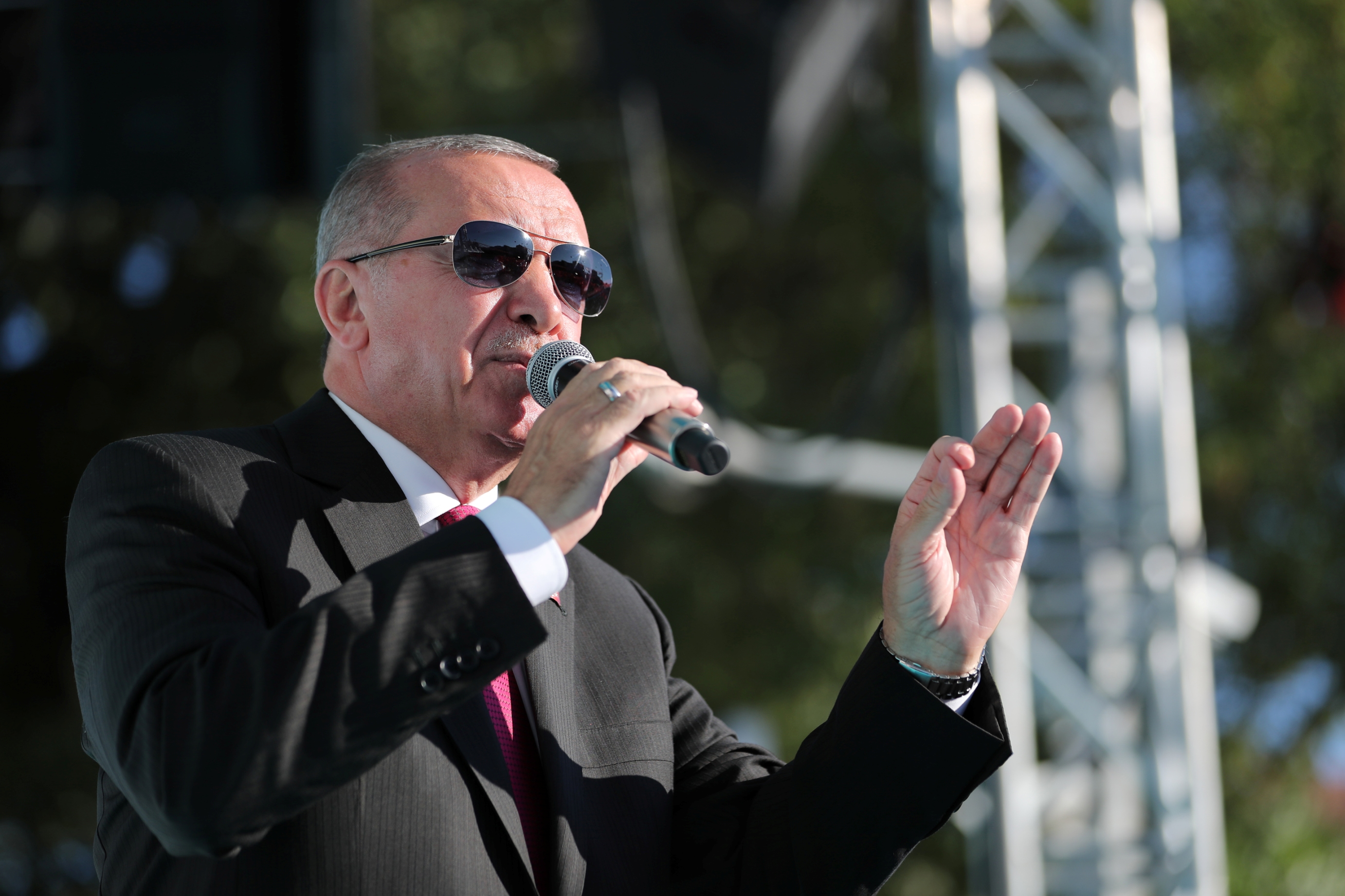 Bu yaz ülkenin değişik yerlerinde ormanların yakıldığına dikkati çeken Erdoğan, "PKK, 'Biz yaktık' dedi. İstanbul'da 12 ağacın yeri değiştirildi diye kıyametler koparanlar nerdesiniz, niye sesiniz çıkmıyor? PKK üstleniyor bütün o ormanların yakılmasını. Niye konuşmuyorsunuz? Bunlar da sanatçı. Bunlar sanatçı değil sanatçı müsveddesi. Çünkü dürüst değiller. Bunlar ikiyüzlü. Dürüst olsalar kalkar derler ki 'Bu canım canım ormanlarımızı yakanları biz de yakarız.' demeleri lazım. Fatih ne diyor? 'Ormanlarımdan bir ağaç kesenin boynunu vururum.' diyor. Biz buradan geliyoruz." sözlerine yer verdi.