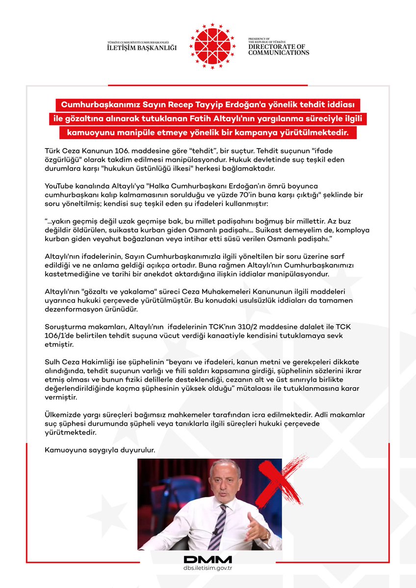 Cumhurbaşkanı Recep Tayyip Erdoğan'a yönelik tehdit iddiası ile gözaltına alınarak tutuklanan Fatih Altaylı'nın yargılanma süreciyle ilgili kamuoyunu manipüle etmeye yönelik bir kampanya yürütülmektedir.
