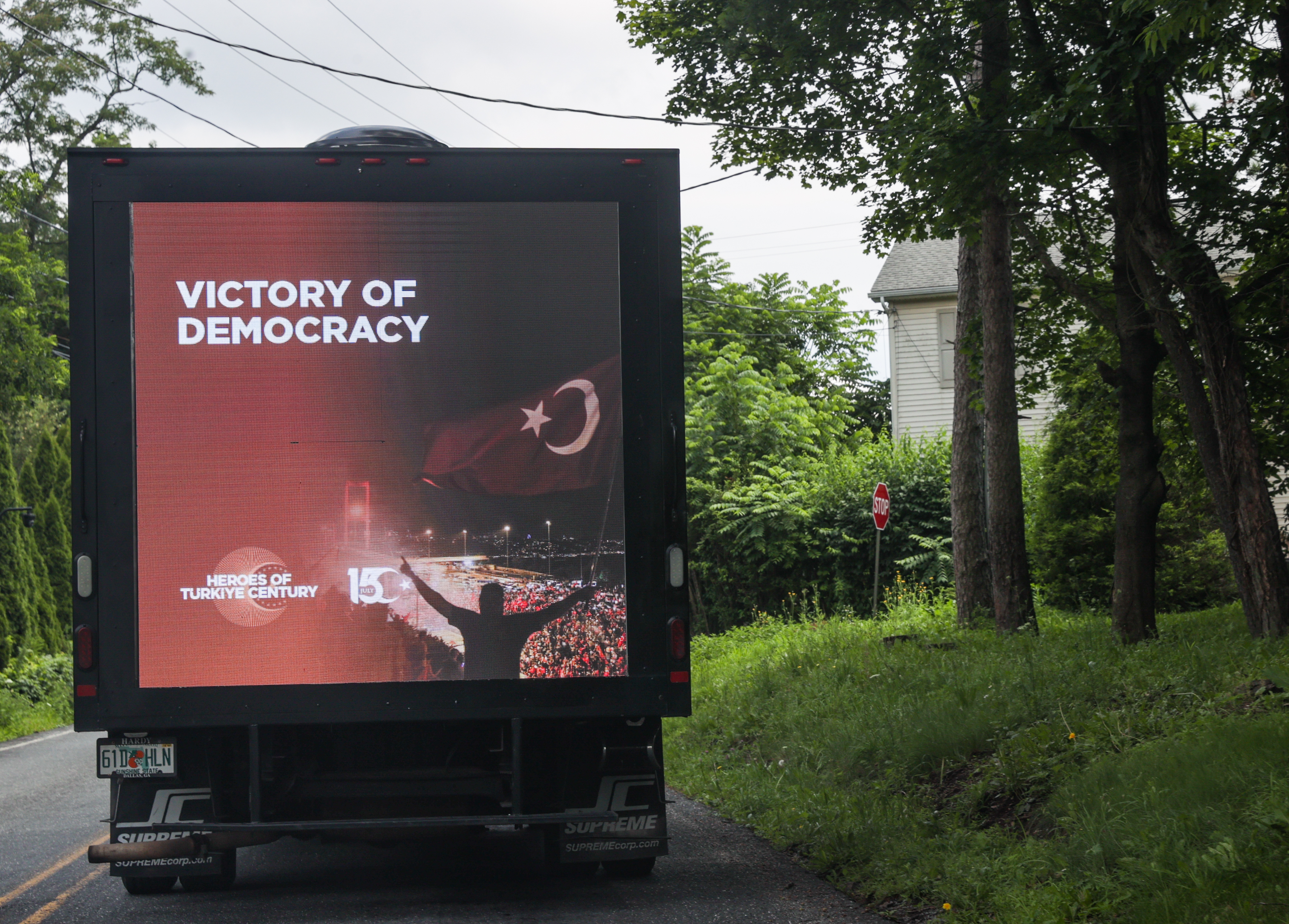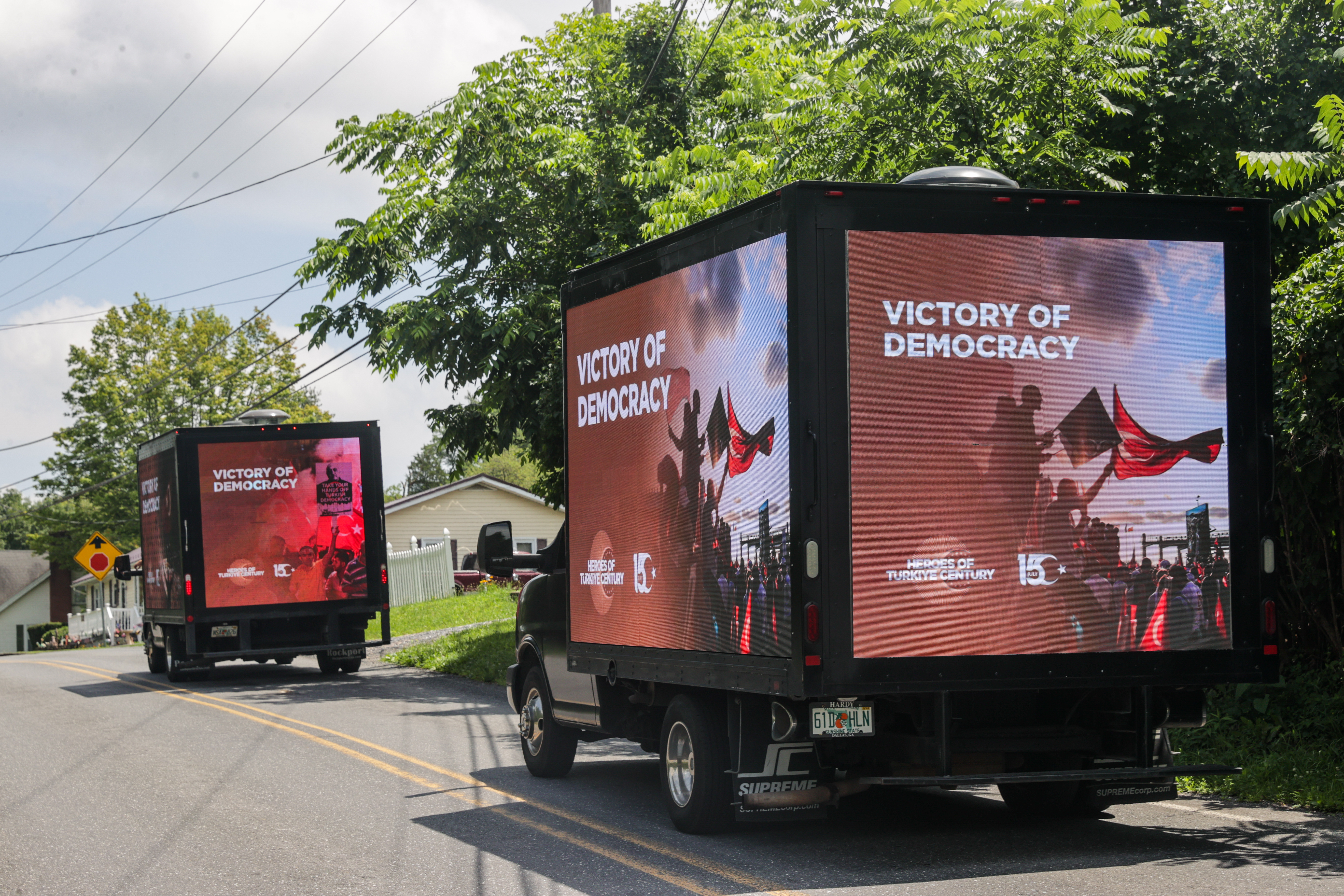 Diğer taraftan ışıklı tabelalarda, Türk bayrağı ve darbe girişimi gecesinden fotoğraflarla birlikte, "Demokrasinin Zaferi" yazan iki araç, FETÖ elebaşının bulunduğu Saylorsburg sokaklarında sabahtan yerel saatle 16.00'ya kadar tur attı.