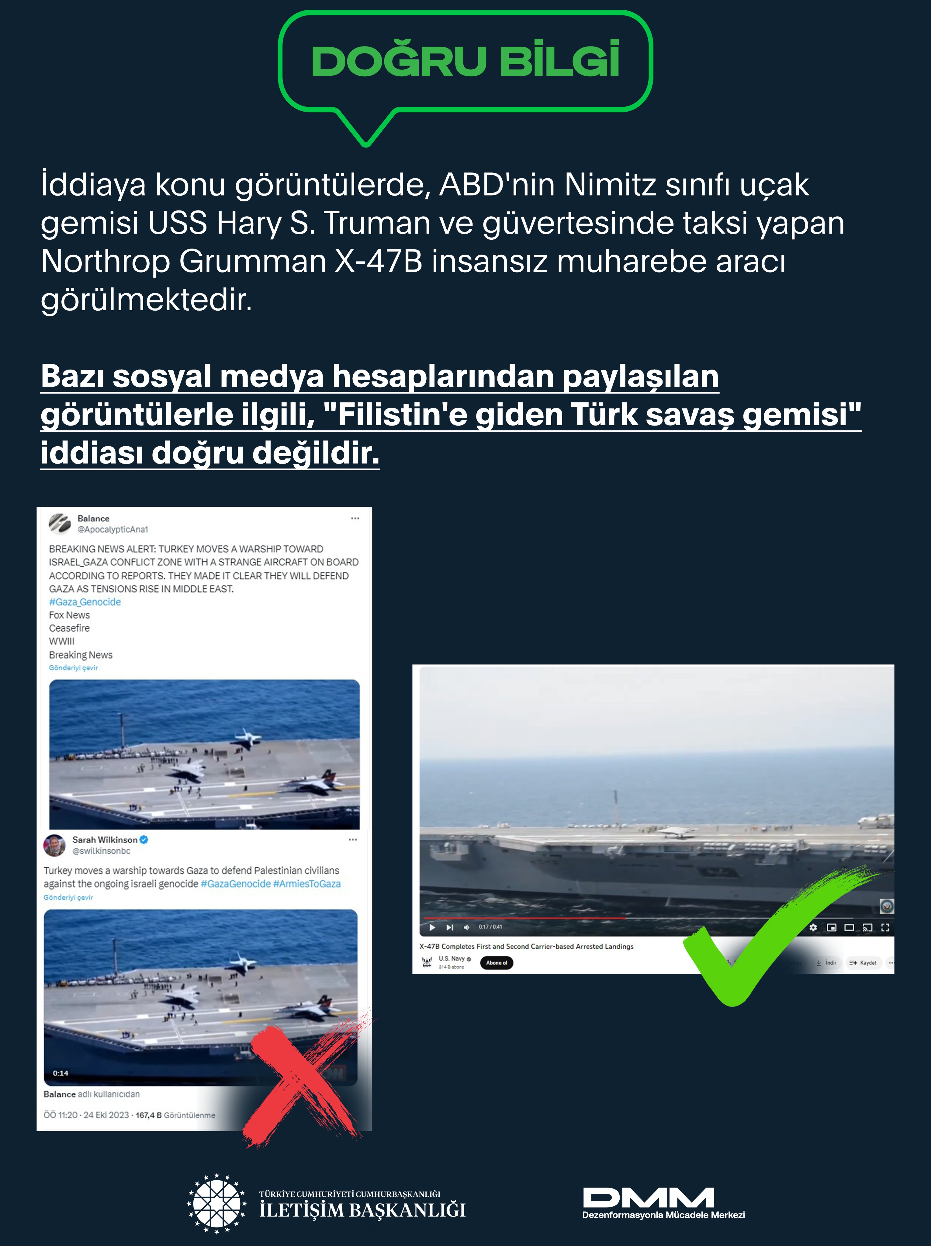 İddiaya konu görüntülerde, ABD'nin Nimitz sınıfı uçak gemisi USS Hary S. Truman ve güvertesinde taksi yapan Northrop Grumman X-47B insansız muharebe aracı görülmektedir.