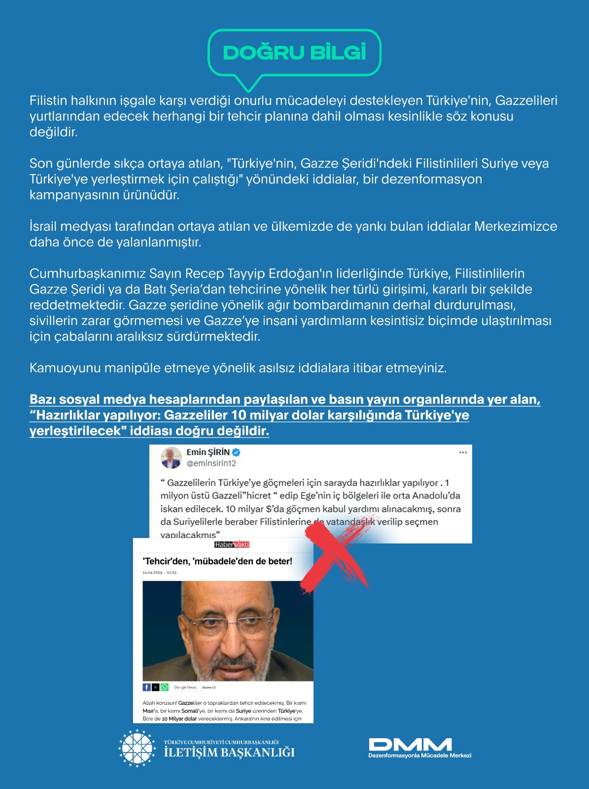 Son günlerde sıkça ortaya atılan, "Türkiye'nin, Gazze Şeridi'ndeki Filistinlileri Suriye veya Türkiye'ye yerleştirmek için çalıştığı" yönündeki iddialar, bir dezenformasyon kampanyasının ürünüdür.