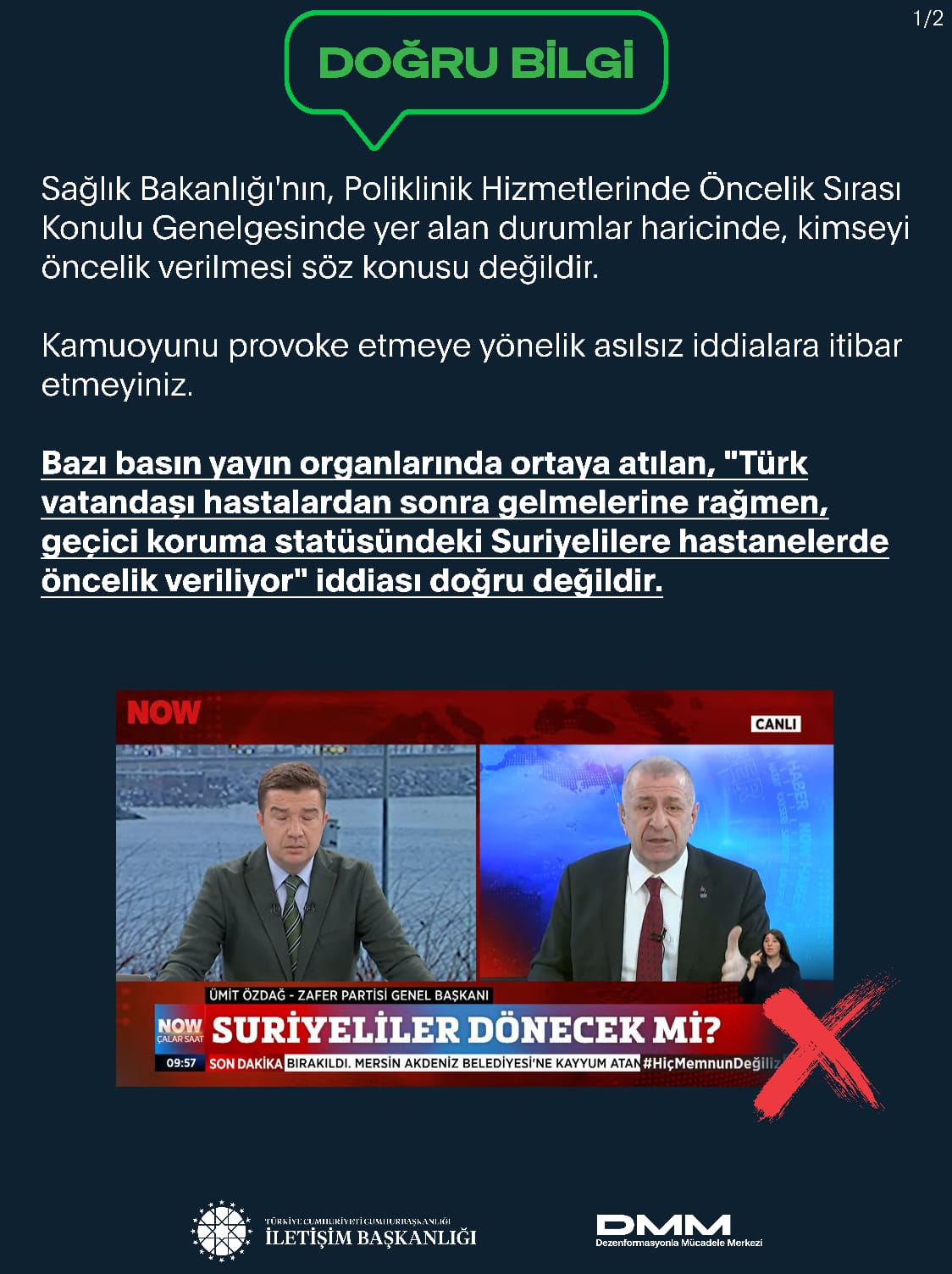 Bazı basın yayın organlarında ortaya atılan, "Türk vatandaşı hastalardan sonra gelmelerine rağmen, geçici koruma statüsündeki Suriyelilere hastanelerde öncelik veriliyor" iddiası doğru değildir.