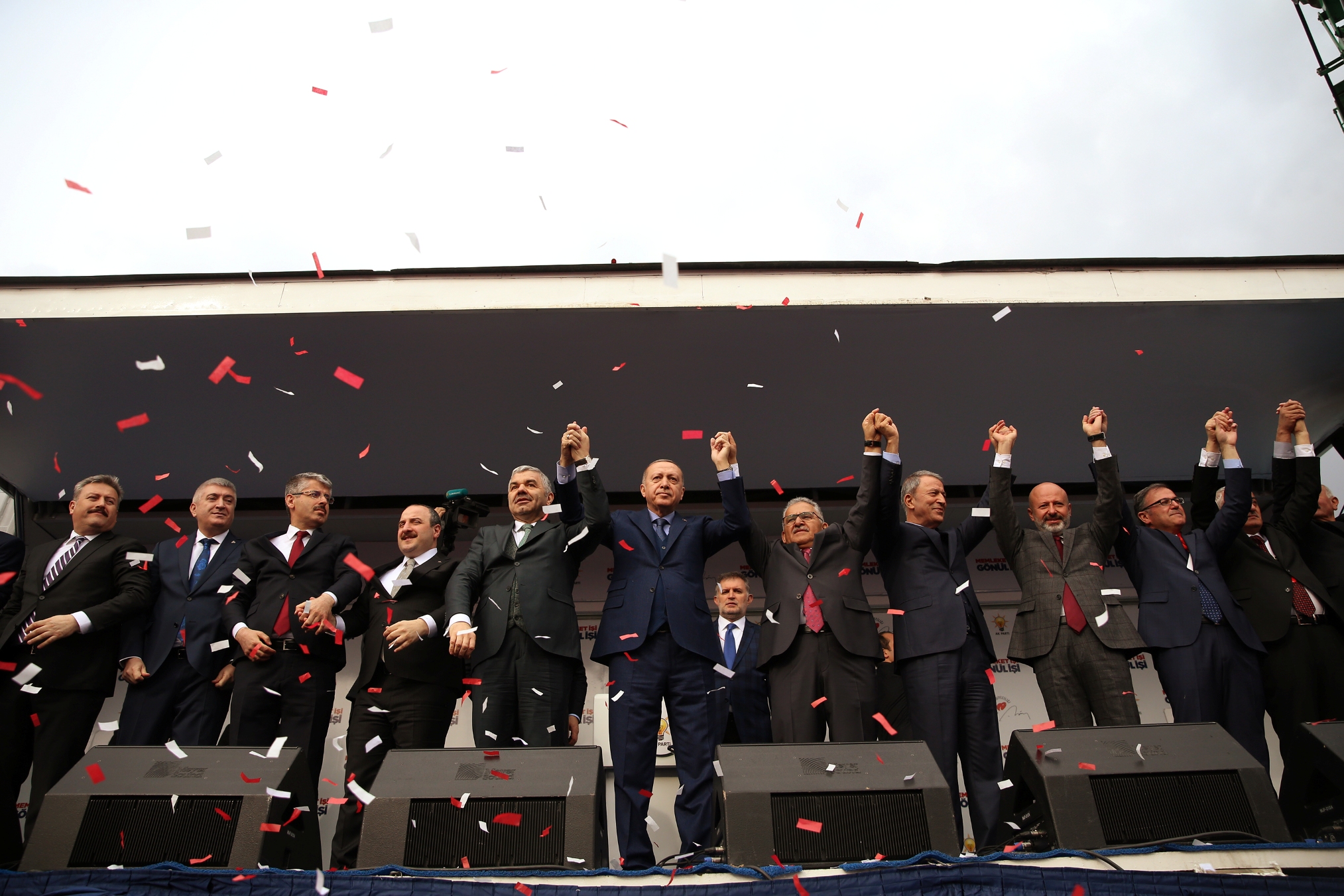 Vatandaşlara, "31 Mart'ta bir kez daha hizmet siyasetini tercih ediyor muyuz, memleket işi gönül işi diyen kadrolarla yola devam ediyor muyuz, tercihimizi bir kez daha istikrar ve güvenden yana kullanıyor muyuz?" diye soran Erdoğan, aldığı olumlu cevap üzerine "Rabb'im hepinizden razı olsun." dedi.