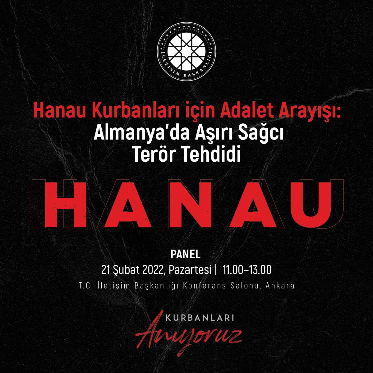 İletişim Başkanlığı Konferans Salonu'nda 21 Şubat pazartesi günü gerçekleştirilecek panelde, Almanya'daki aşırı sağcı terör tehdidi tartışılacak.