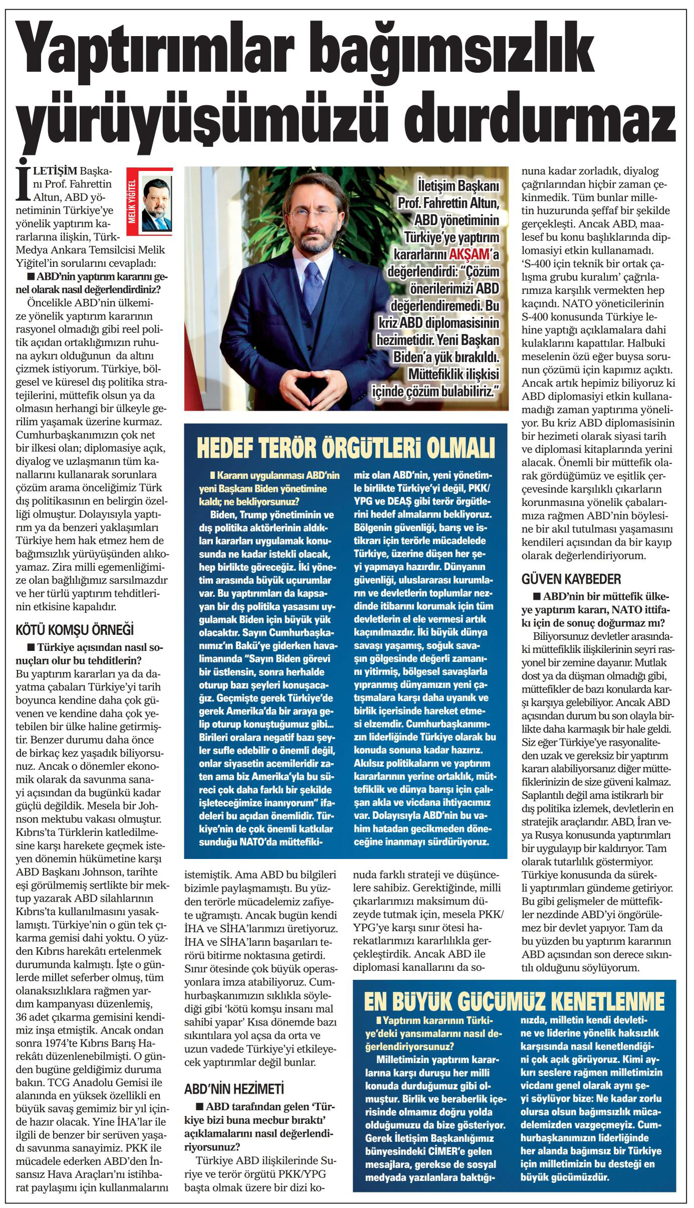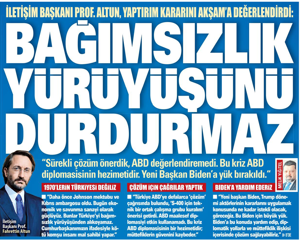 Biden, Trump yönetiminin ve dış politika aktörlerinin aldıkları kararları uygulamak konusunda ne kadar istekli olacak, hep birlikte göreceğiz. İki yönetim arasında büyük uçurumlar var. Bu yaptırımları da kapsayan bir dış politika yasasını uygulamak Biden için büyük yük olacaktır. Sayın Cumhurbaşkanımız’ın Bakü’ye giderken havalimanında “Sayın Biden şöyle görevi bir üstlensin, görevi üstlendikten sonra herhalde Sayın Biden'la da oturup bazı şeyleri konuşacağız. Geçmişte gerek Türkiye'de gerek Amerika'da bir araya gelip oturup konuştuğumuz gibi yine bunları konuşacağız. Birileri oralara negatif bazı şeyler sufle edebilir o önemli değil, onlar siyasetin acemileridir zaten ama biz Amerika'yla bu süreci çok daha farklı bir şekilde işleteceğimize inanıyorum.” ifadeleri bu açıdan önemlidir. Türkiye’nin de çok önemli katkılar sunduğu NATO’da müttefikimiz olan ABD’nin, yeni yönetimle birlikte Türkiye’yi değil, PKK/YPG ve DEAŞ gibi terör örgütlerini hedef almalarını bekliyoruz. Bölgenin güvenliği, barış ve istikrarı için terörle mücadelede Türkiye, üzerine düşen her şeyi yapmaya hazırdır. Dünyanın güvenliği, uluslararası kurumların ve devletlerin toplumlar nezdinde itibarını korumak için tüm devletlerin el ele vermesi artık kaçınılmazdır. İki büyük dünya savaşı yaşamış, soğuk savaşın gölgesinde değerli zamanını yitirmiş, bölgesel savaşlarla yıpranmış dünyamızın yeni çatışmalara karşı daha uyanık ve birlik içerisinde hareket etmesi elzemdir. Cumhurbaşkanımızın liderliğinde Türkiye olarak bu konuda sonuna kadar hazırız. Akılsız politikaların ve yaptırım kararlarının yerine ortaklık, müttefiklik ve dünya barışı için çalışan akla ve vicdana ihtiyacımız var. Dolayısıyla ABD’nin bu vahim hatadan gecikmeden döneceğine inanmayı sürdürüyoruz.