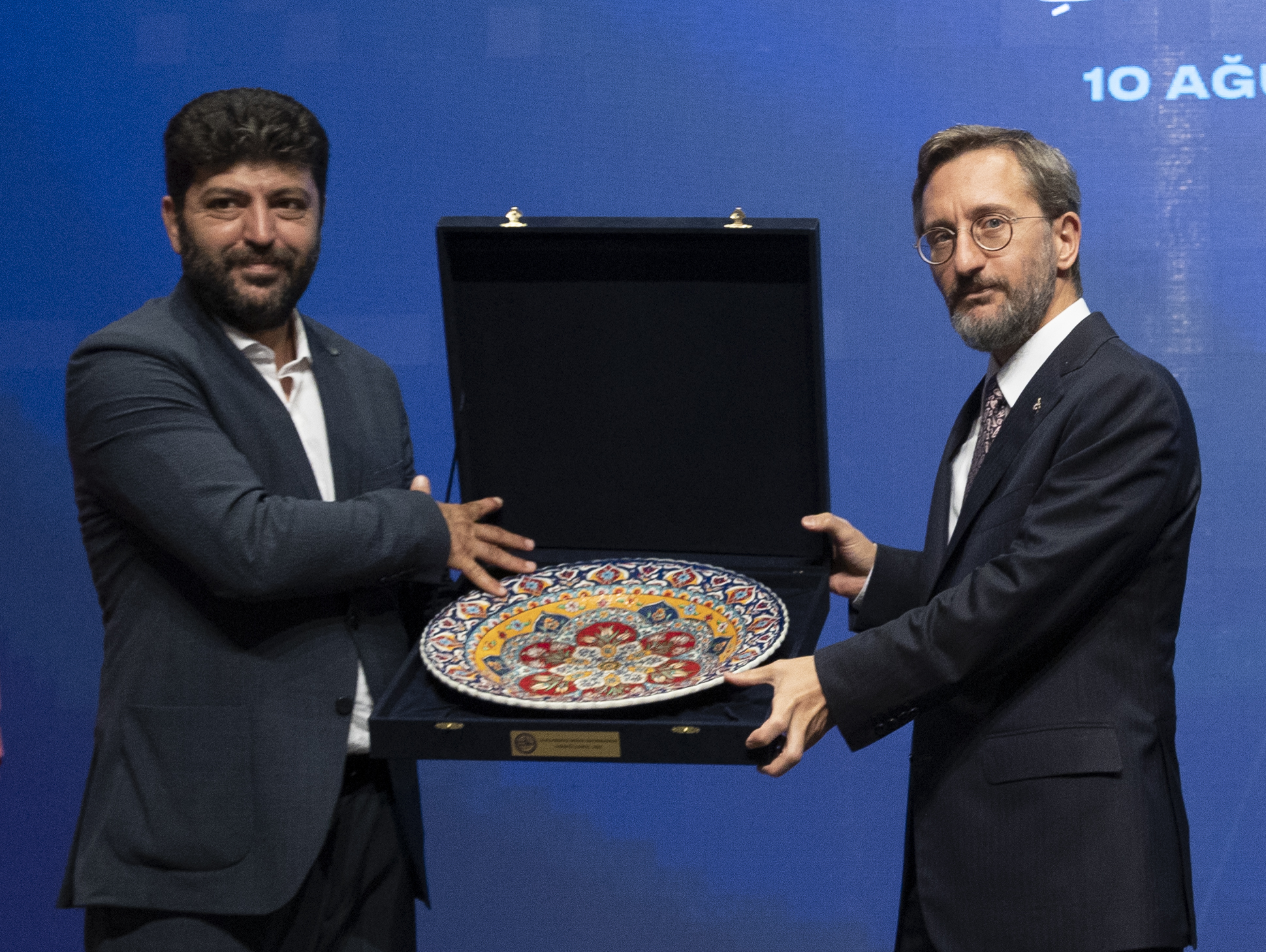 İletişim Başkanı Altun'a, konuşmasının ardından, UMED Başkanı Aslan Değirmenci tarafından çini tabak armağan edildi.