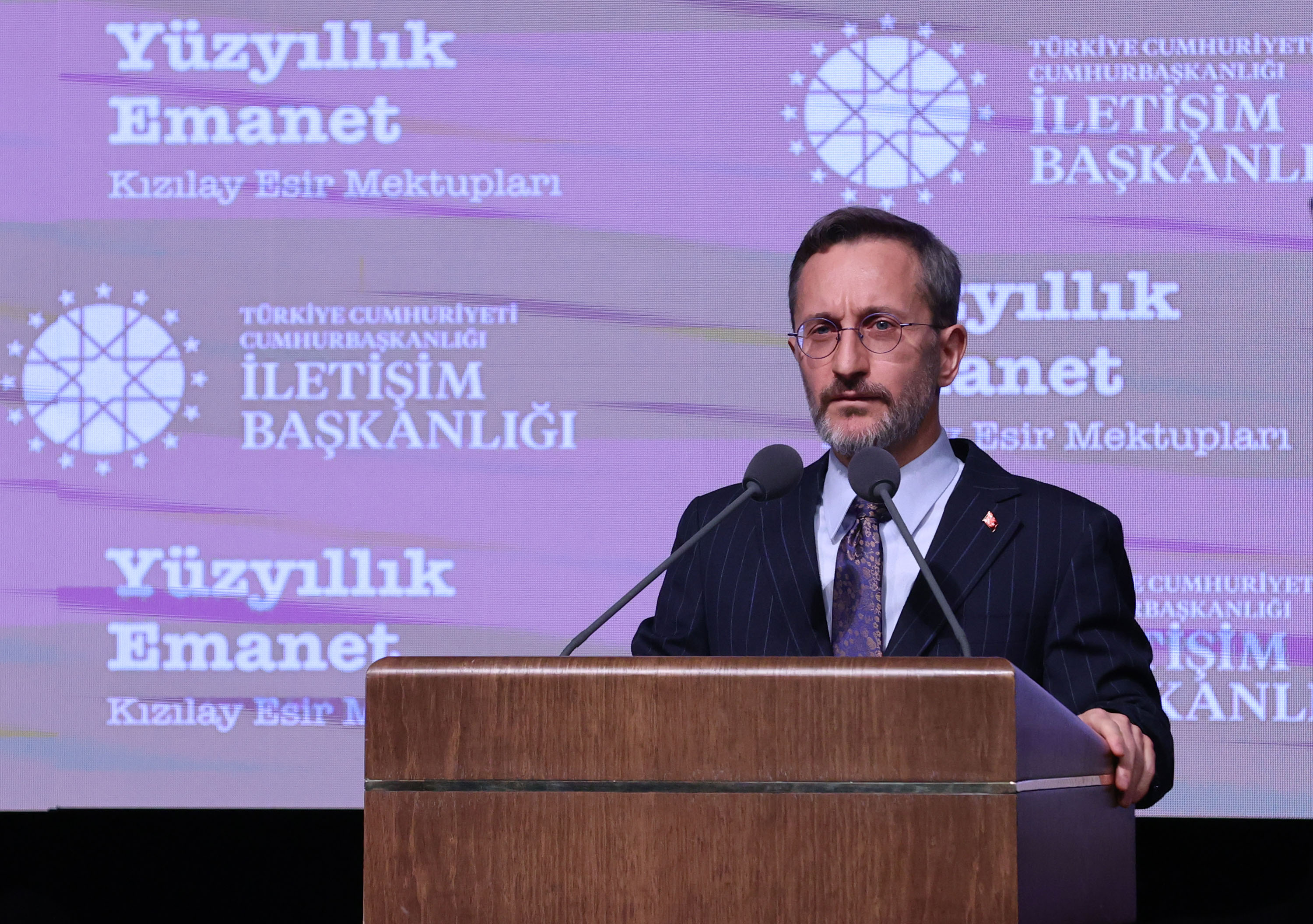 Cumhurbaşkanlığı İletişim Başkanı Fahrettin Altun, Cumhurbaşkanı Recep Tayyip Erdoğan'ın eşi Emine Erdoğan'ın katılımıyla Millet Kütüphanesi Anadolu Salonu'nda düzenlenen "Yüzyıllık Emanet: Kızılay Esir Mektupları Sergisi"nin açılış programındaki konuşmasında, Cumhurbaşkanlığı İletişim Başkanlığı olarak Türk Kızılay ve TRT ile birlikte düzenledikleri serginin açılışında davetlilerle birlikte olmaktan duyduğu memnuniyeti ifade etti.