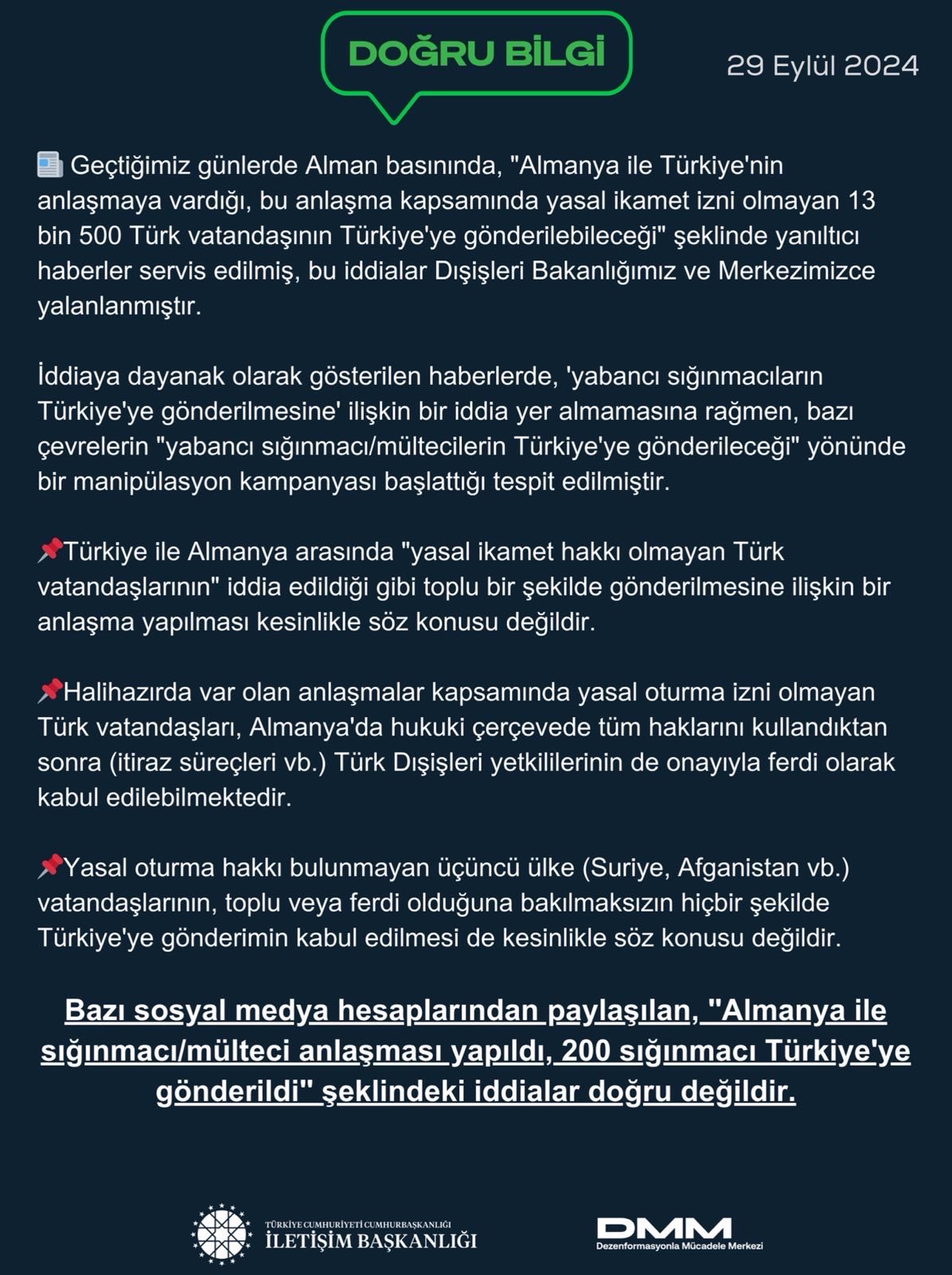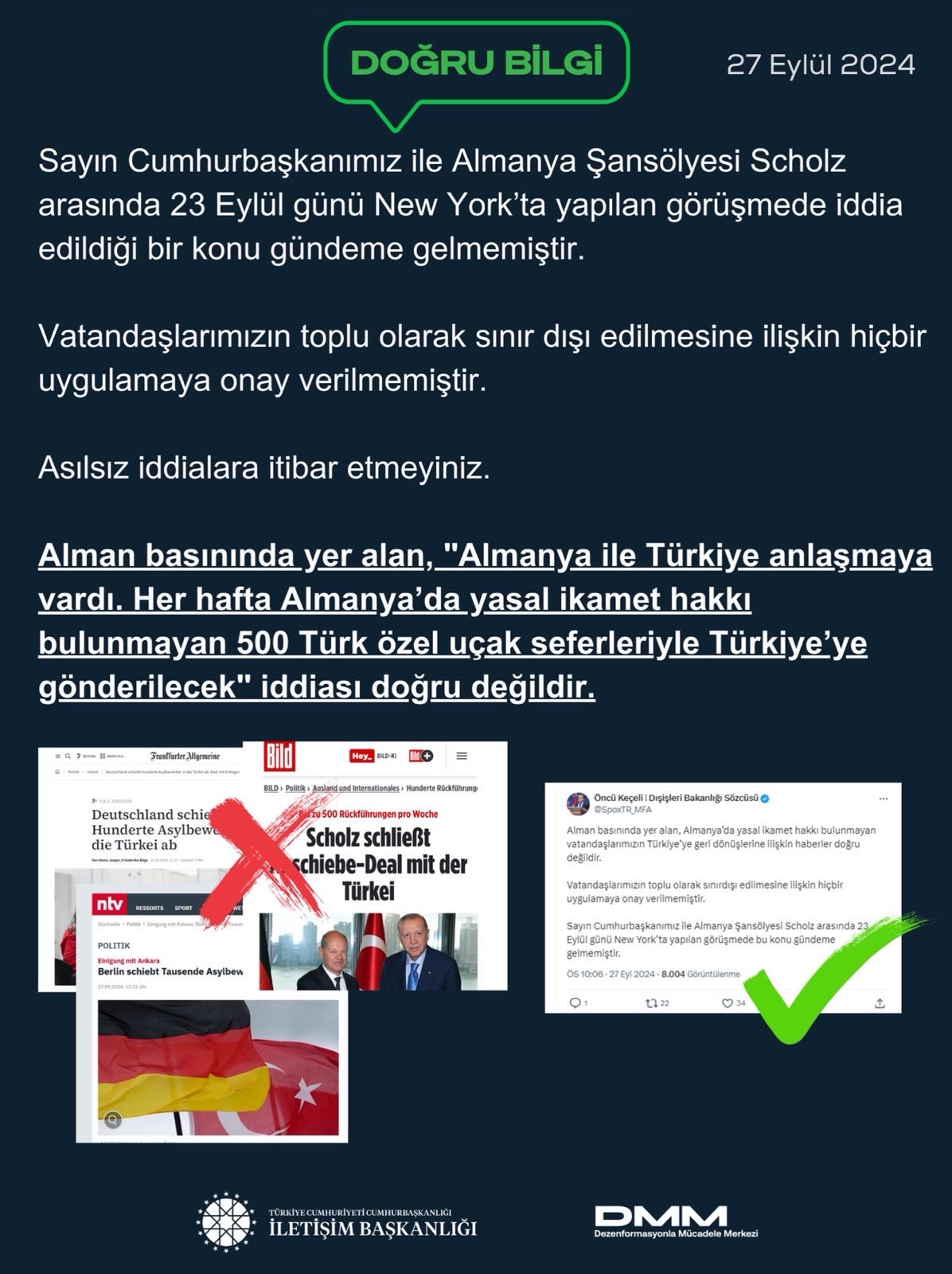 Bununla birlikte, "Cumhurbaşkanımız Sayın Recep Tayyip Erdoğan ile Almanya Şansölyesi Sayın Scholz'un, her hafta yasal oturma hakkı olmayan 500 Türk vatandaşının Türkiye'ye gönderilmesi konusunda anlaştığı" ileri sürülmüş, bu iddia da 27 Eylül 2024 tarihinde Dışişleri Bakanlığımız ve Merkezimiz tarafından kesin bir dille yalanlanmıştır.