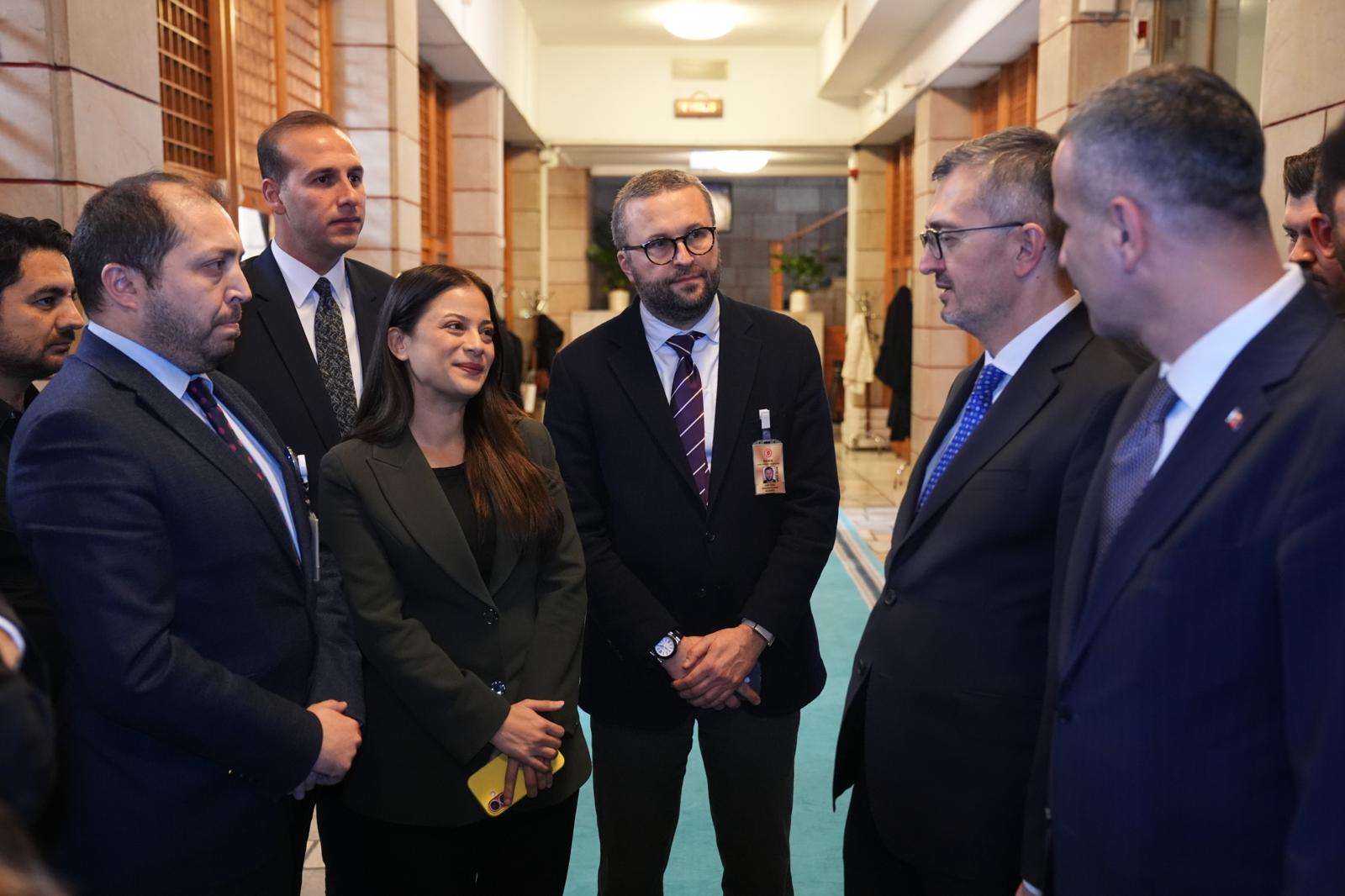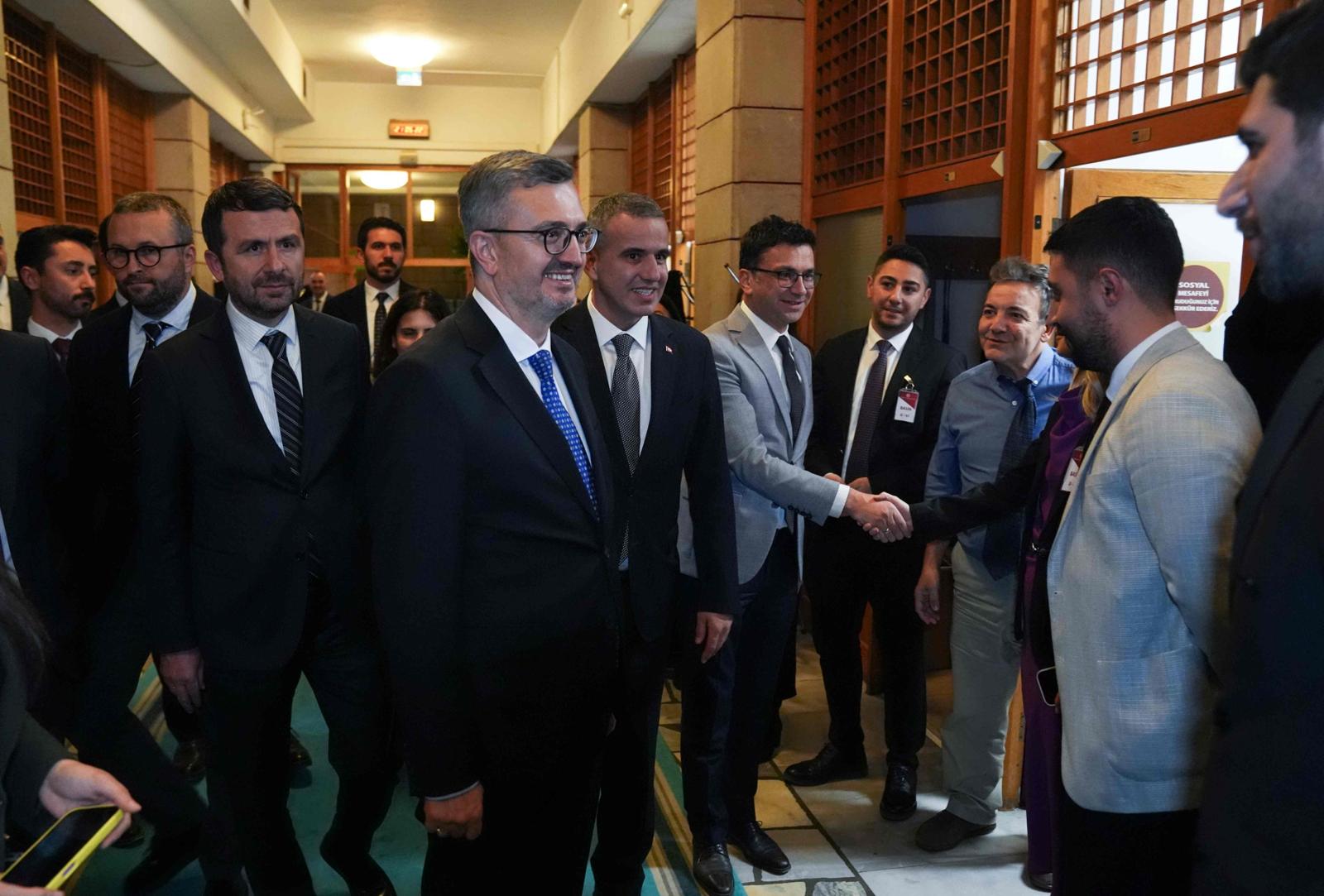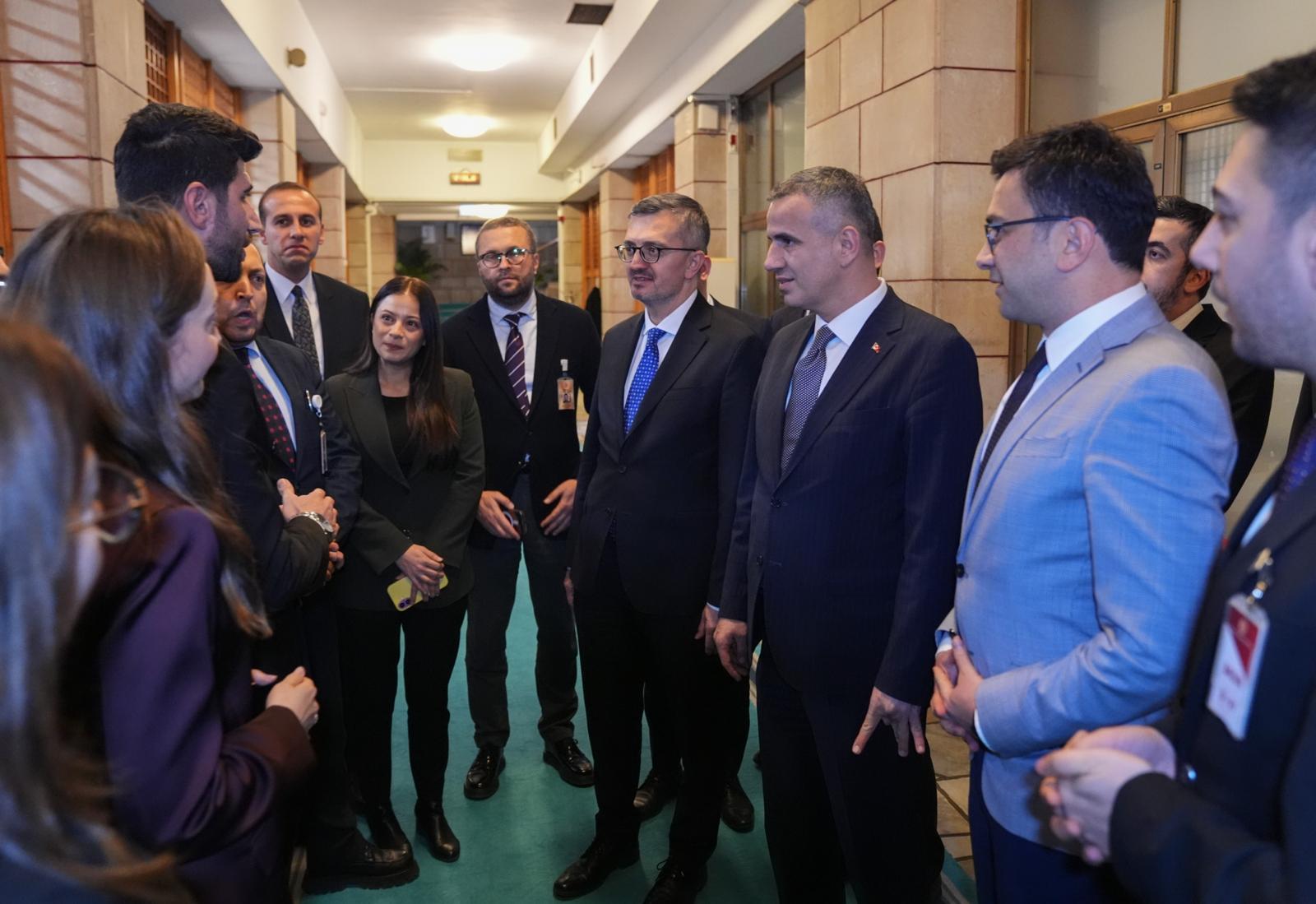 Koridordaki büroları ziyaret eden İletişim Başkanı Duran, parlamento muhabirleri ile bir araya geldi.