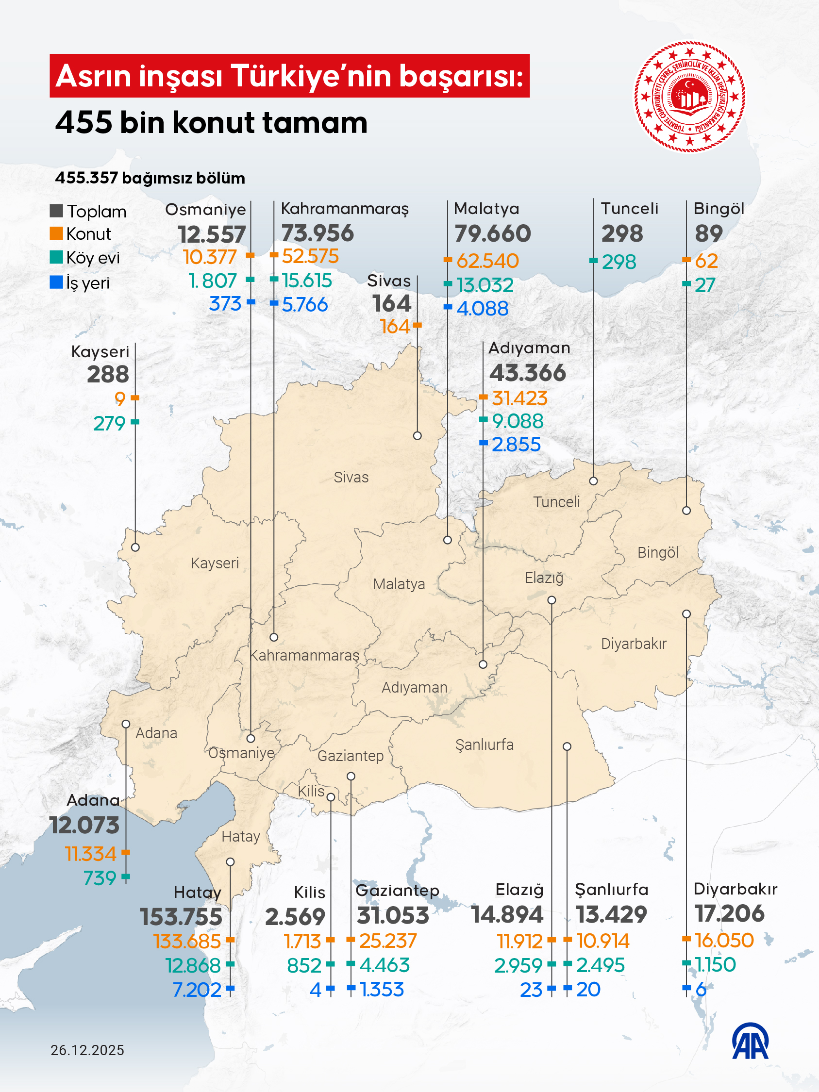 Yarın Sayın Cumhurbaşkanımızın teşrifleriyle Hatay’da düzenlenecek “Asrın İnşası Türkiye’nin Başarısı: 455 Bin Konut Tamam” temalı programla bu büyük emek taçlanacak, bağımsız bölümlerin tamamı hak sahibi kardeşlerimize teslim edilecek.