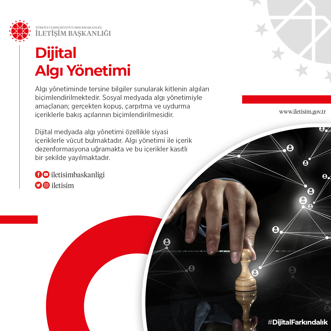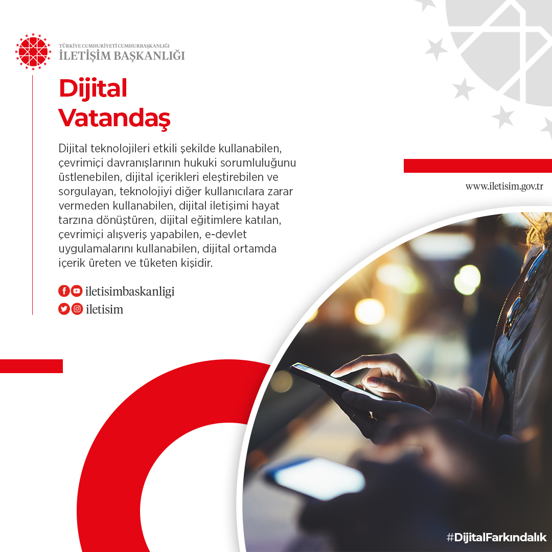 Fahrettin Altun, #DijitalFarkındalık etiketiyle yaptığı paylaşımda, “dünyada ve Türkiye’de sosyal medya kullanımı”, “dijital farkındalık ve siber vatan”, “dijital vatandaş”, “dijital diplomasi”, “dijital algı yönetimi”, “siber güvenlik” ve “yapay zeka” konularından bilgi kartlarına yer verdi.