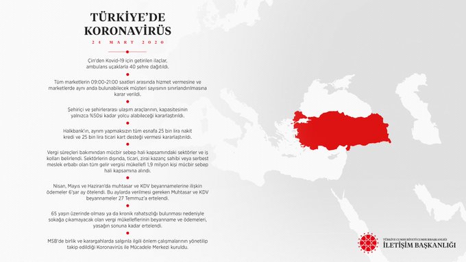 "Koronavirüsle mücadele kapsamında milletimiz sosyal mesafeyi artırırken biz de virüse karşı cepheyi genişletiyoruz. Son 24 saatte aldığımız önlemler mücadelemize ivme kazandıracak, devlet-millet el ele inşallah bu süreci atlatmamıza katkı sağlayacak."