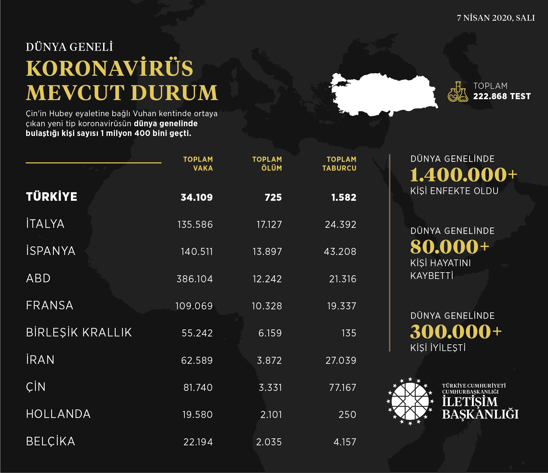 "Türkiye’de şu ana kadar toplam 222.868 test yapılmış olup, 34.109 Koronavirüs vakası tespit edilmiş, 725 vatandaşımız hayatını kaybetmiş, 1.582 hasta iyileşmiştir."