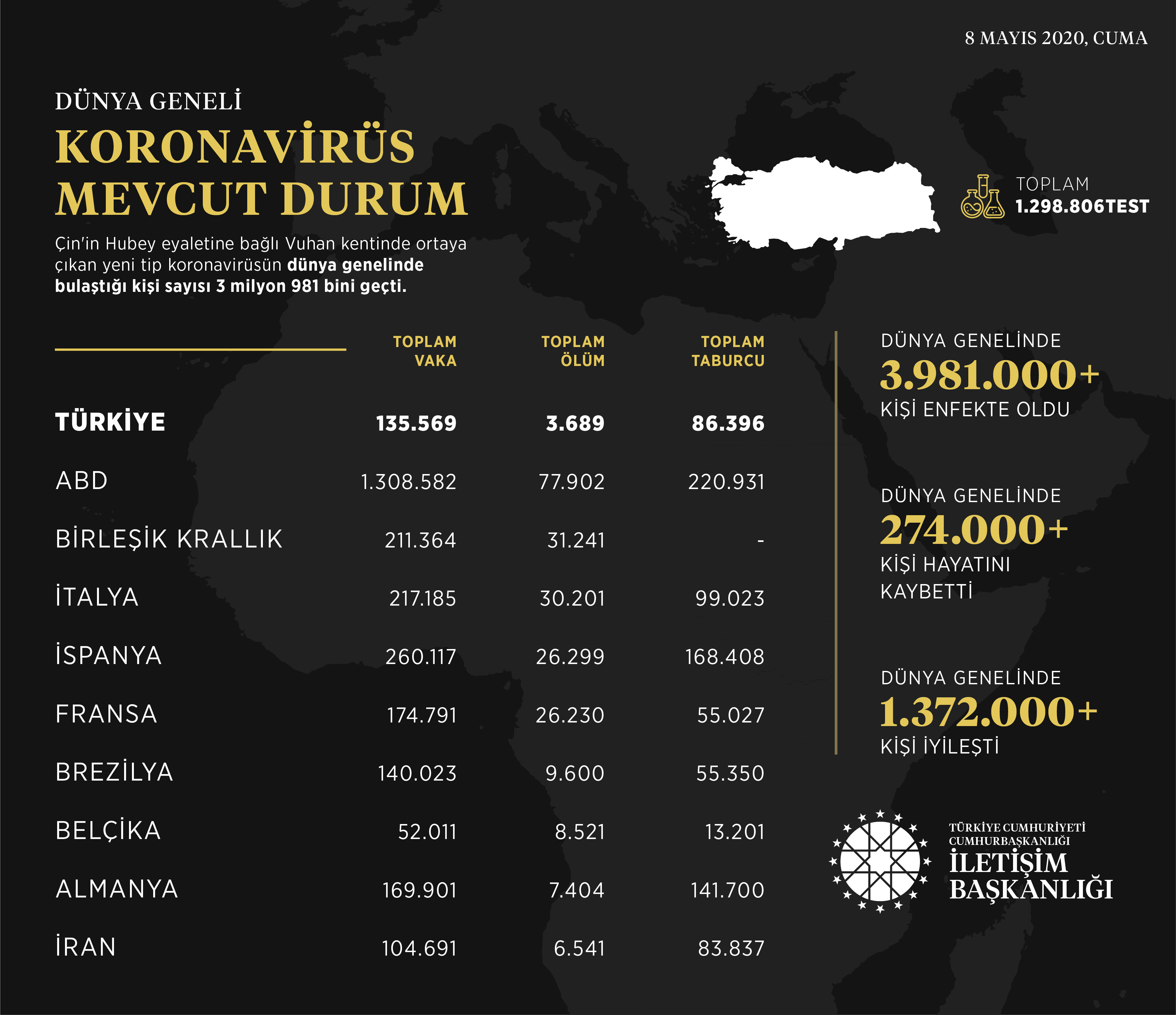 Başkanlığın Twitter hesabından yapılan paylaşımda, Çin'in Hubey eyaletine bağlı Vuhan kentinde ortaya çıkan Kovid-19'un dünya genelinde bulaştığı kişi sayısının 3 milyon 981 bini geçtiği, 274 binden fazla kişinin hayatını kaybettiği, 1 milyon 372 binden fazla kişinin de iyileştiği belirtildi.