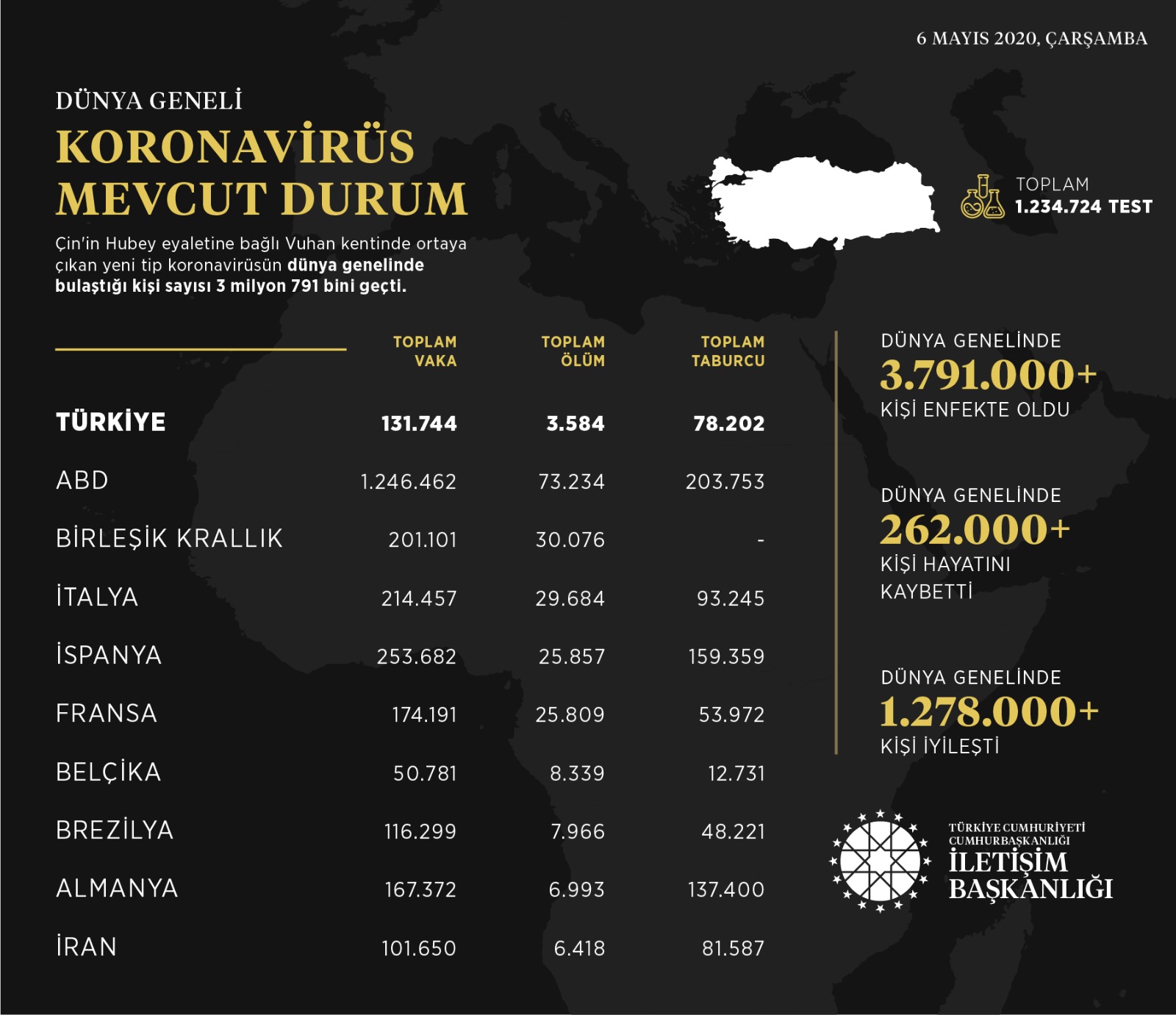 Başkanlığın Twitter hesabından yapılan paylaşımda, Çin'in Hubey eyaletine bağlı Vuhan kentinde ortaya çıkan Kovid-19'un dünya genelinde bulaştığı kişi sayısının 3 milyon 791 bini geçtiği, 262 binden fazla kişinin hayatını kaybettiği, 1 milyon 278 binden fazla kişinin de iyileştiği belirtildi.