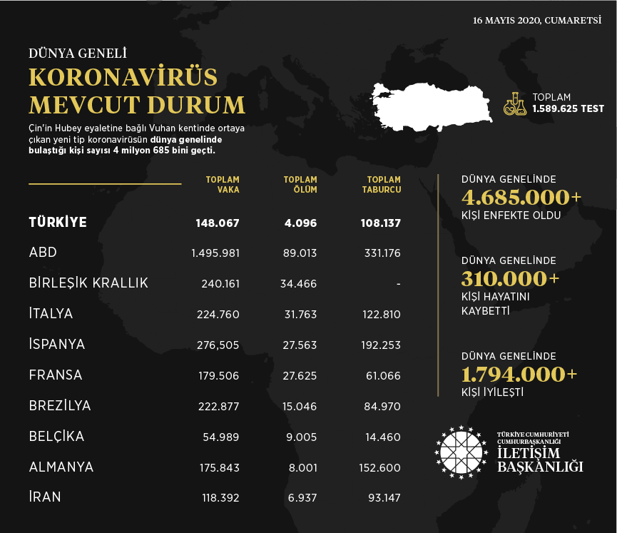 Başkanlığın Twitter hesabından yapılan paylaşımda, Çin'in Hubey eyaletine bağlı Vuhan kentinde ortaya çıkan Kovid-19'un dünya genelinde bulaştığı kişi sayısının 4 milyon 685 bini geçtiği, 310 binden fazla kişinin hayatını kaybettiği, 1 milyon 794 binden fazla kişinin de iyileştiği belirtildi.