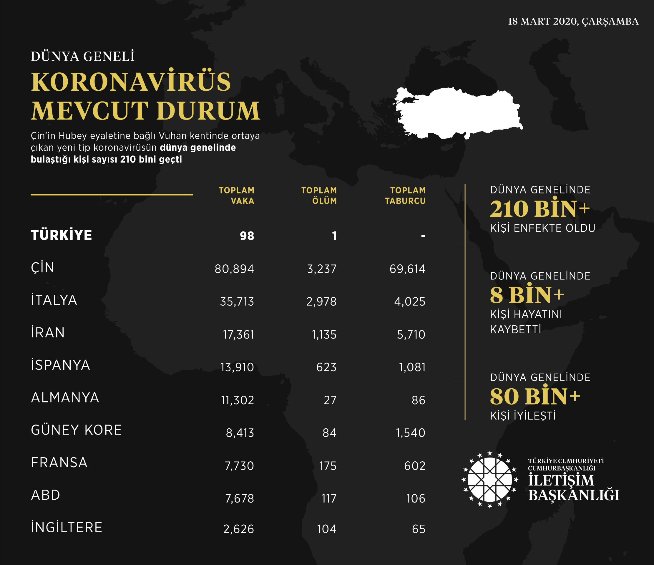 İletişim Başkanlığının, Twitter hesabından yapılan paylaşımda, koronavirüsün dünya genelinde vaka sayısının 210 bini geçtiği, 8 binden fazla kişinin hayatını kaybettiği ve 80 binden fazla kişinin ise iyileştiği belirtildi.