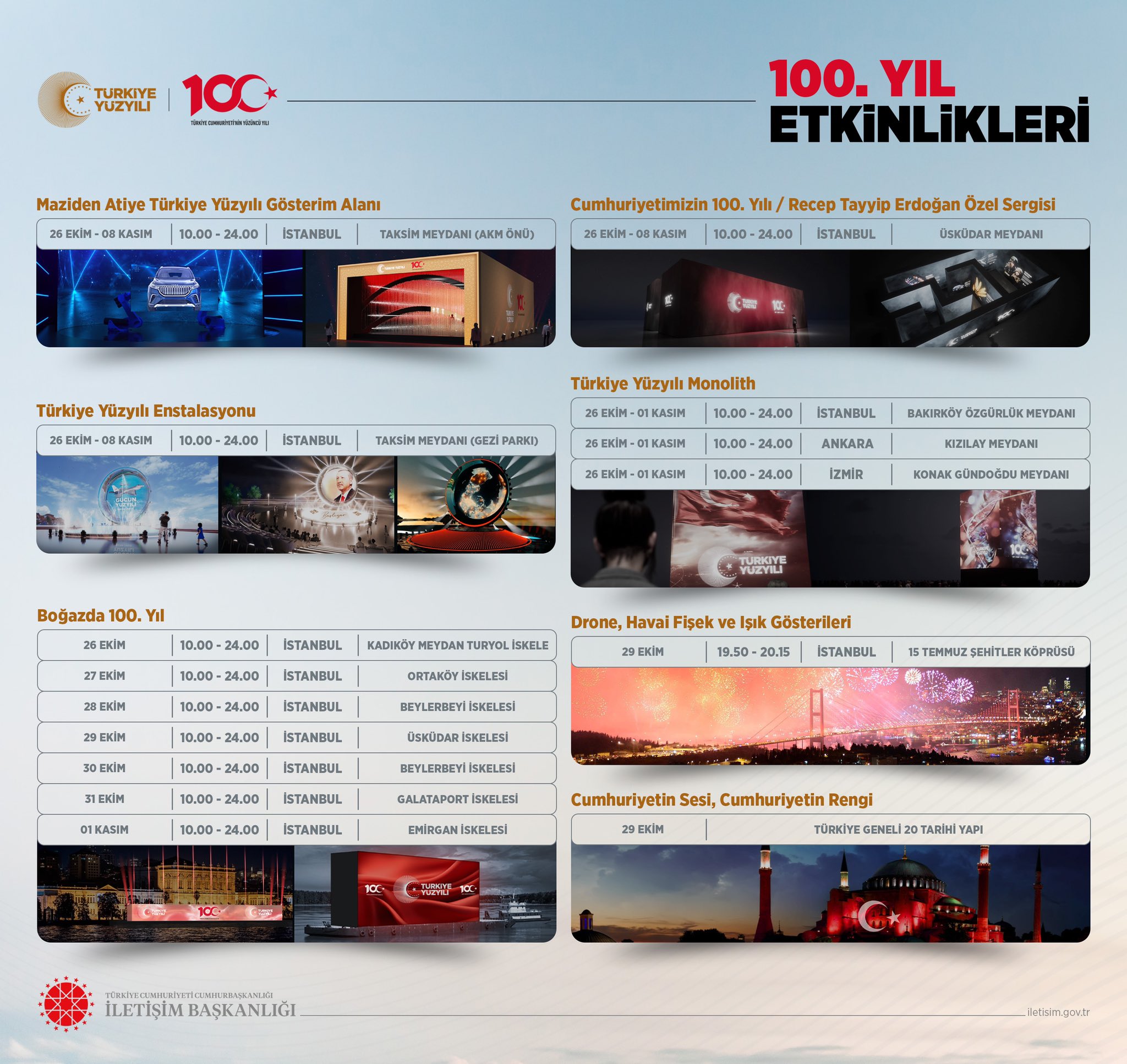 Öte yandan "Recep Tayyip Erdoğan Özel Sergisi", "Maziden Atiye Türkiye Yüzyılı’" gösterim alanı ve "Türkiye Yüzyılı Enstalasyonu" 8 Kasım, "Türkiye Yüzyılı Monolithi" ve "Boğazda 100. Yıl Gezici Yüzer İskelesi" ise 1 Kasım’a kadar 10.00-00.00 saatleri arasında ziyaret edilebilecek.