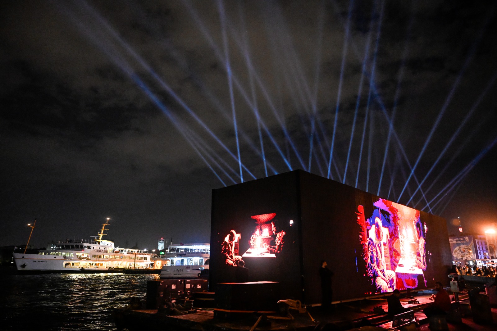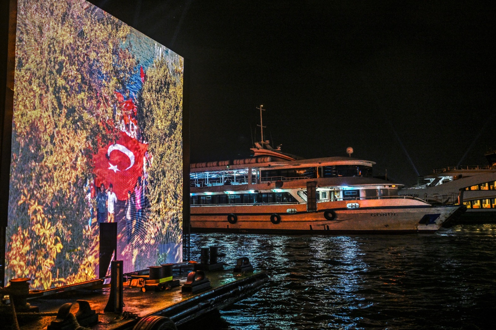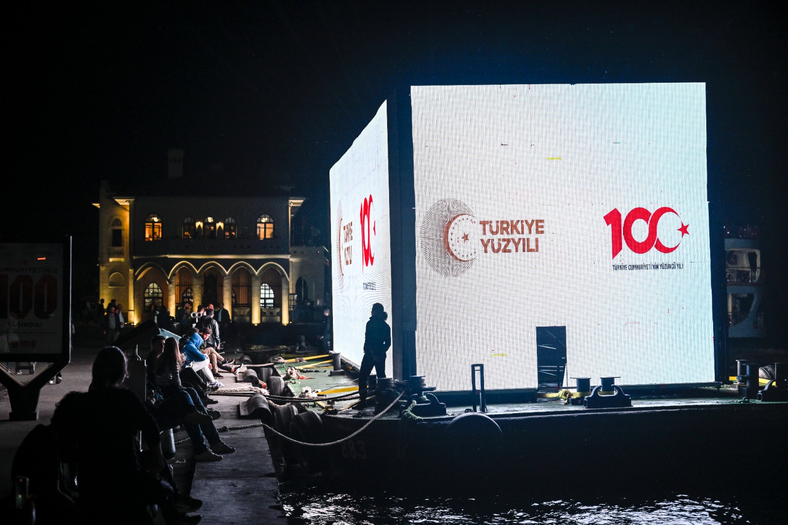 Kadıköy Meydanı'nda bulunan "Boğaz’da 100. Yıl Gezici Yüzer İskelesi"ne dev ekran kuruldu.