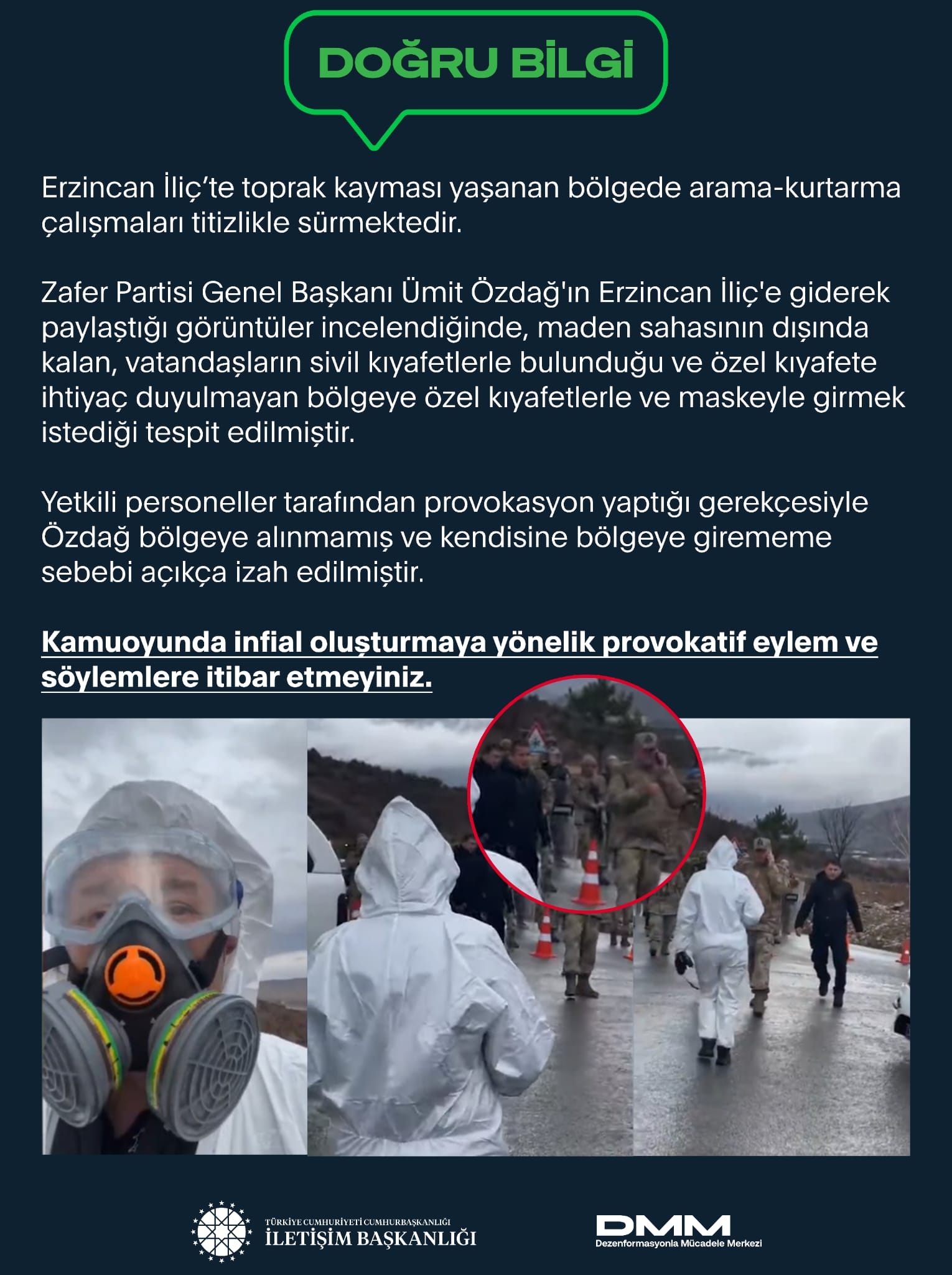 Zafer Partisi Genel Başkanı Ümit Özdağ'ın Erzincan İliç'e giderek paylaştığı görüntüler incelendiğinde, maden sahasının dışında kalan, vatandaşların sivil kıyafetlerle bulunduğu ve özel kıyafete ihtiyaç duyulmayan bölgeye özel kıyafetlerle ve maskeyle girmek istediği tespit edilmiştir.