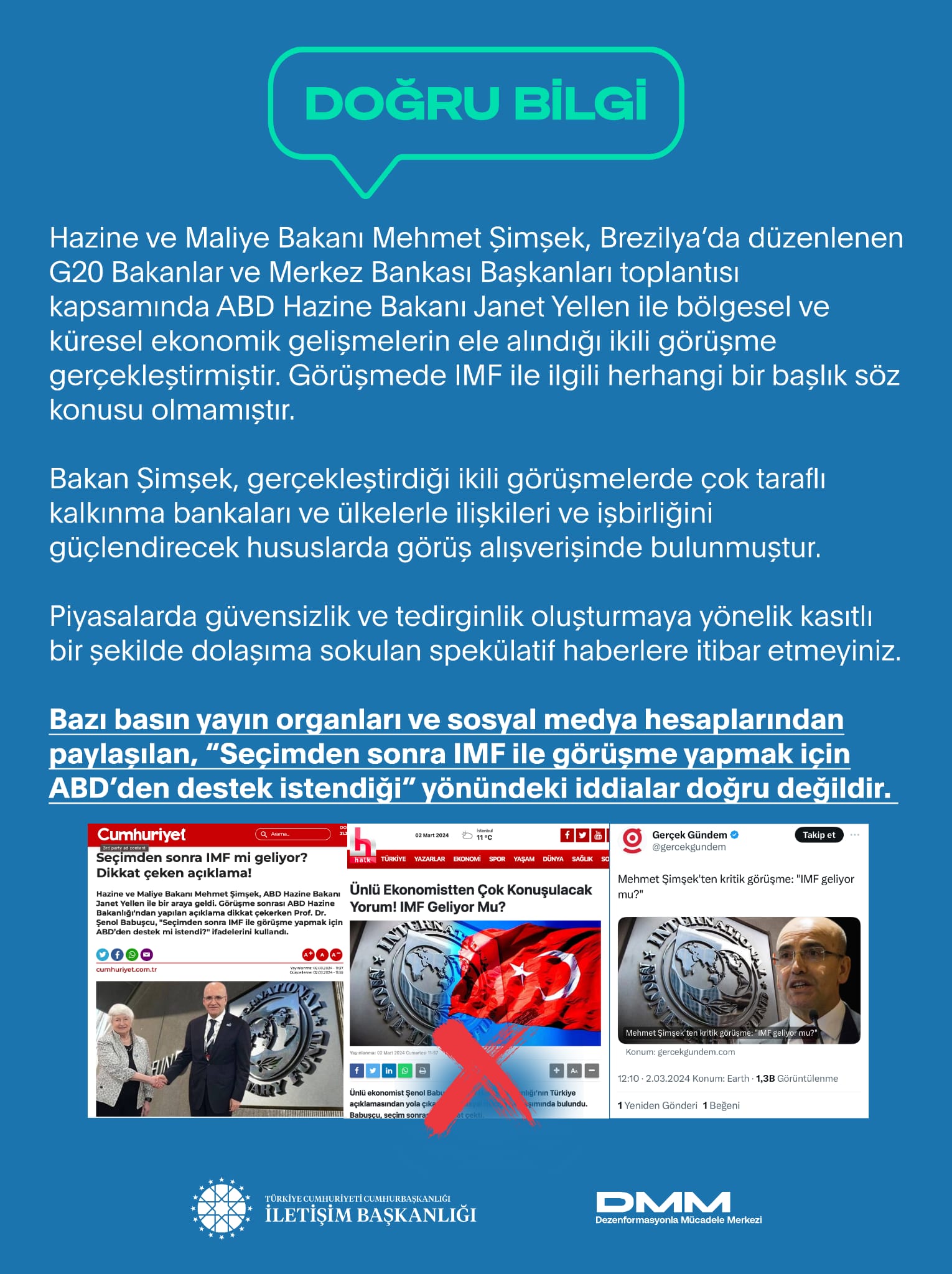 Bazı basın yayın organları ve sosyal medya hesaplarından paylaşılan, “Seçimden sonra IMF ile görüşme yapmak için ABD’den destek istendiği” yönündeki iddialar doğru değildir.