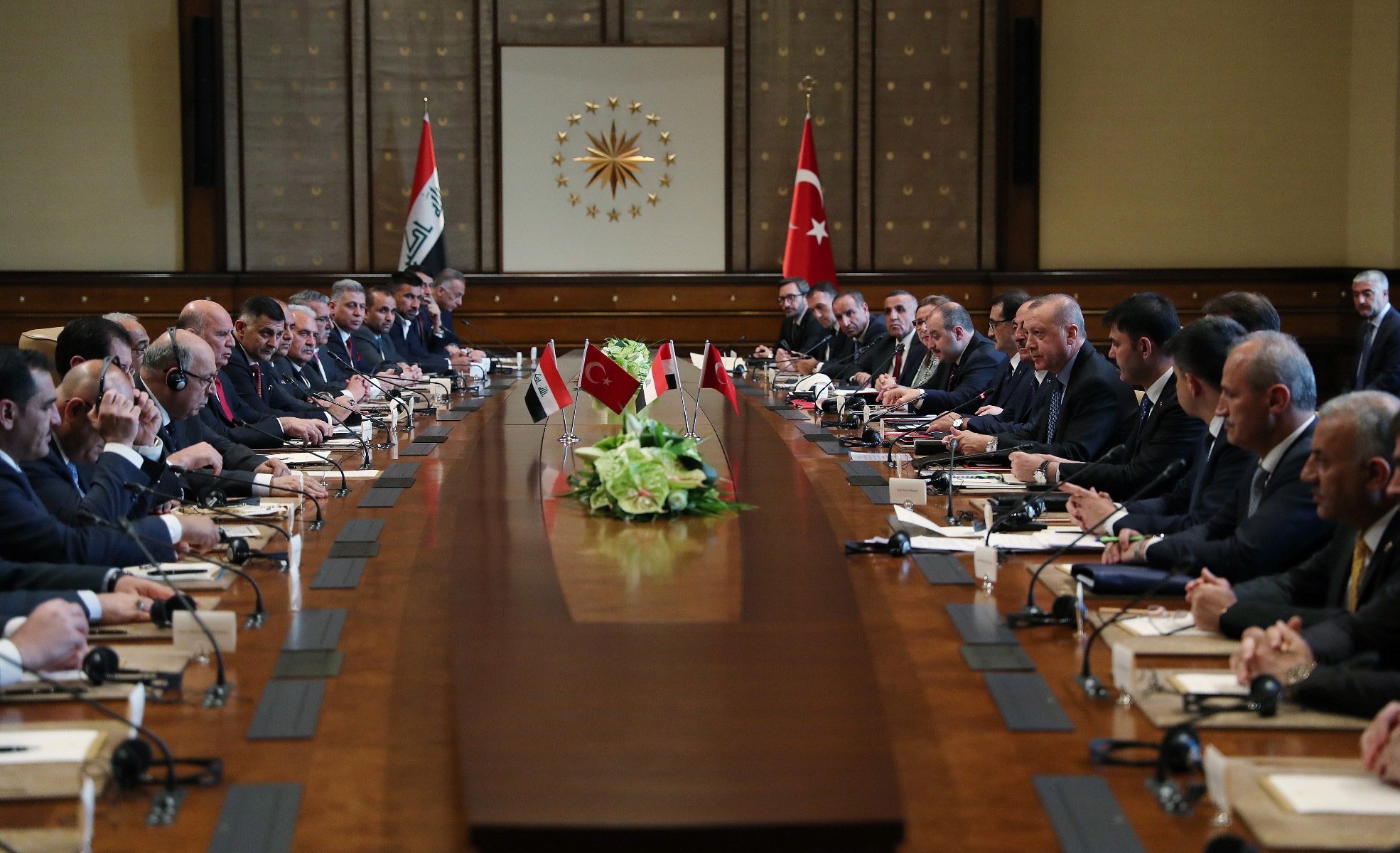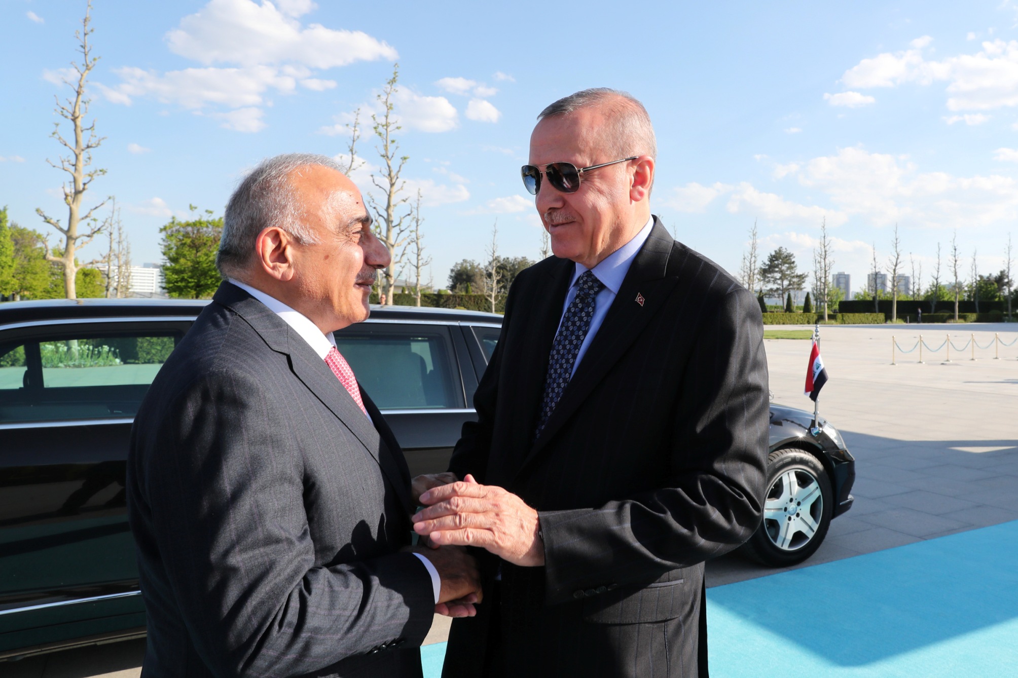 İki ülke heyetlerinin takdimi sonrasında Erdoğan ve Abdulmehdi, merdivenlerde Türkiye ve Irak bayrakları önünde gazetecilere poz verdi.