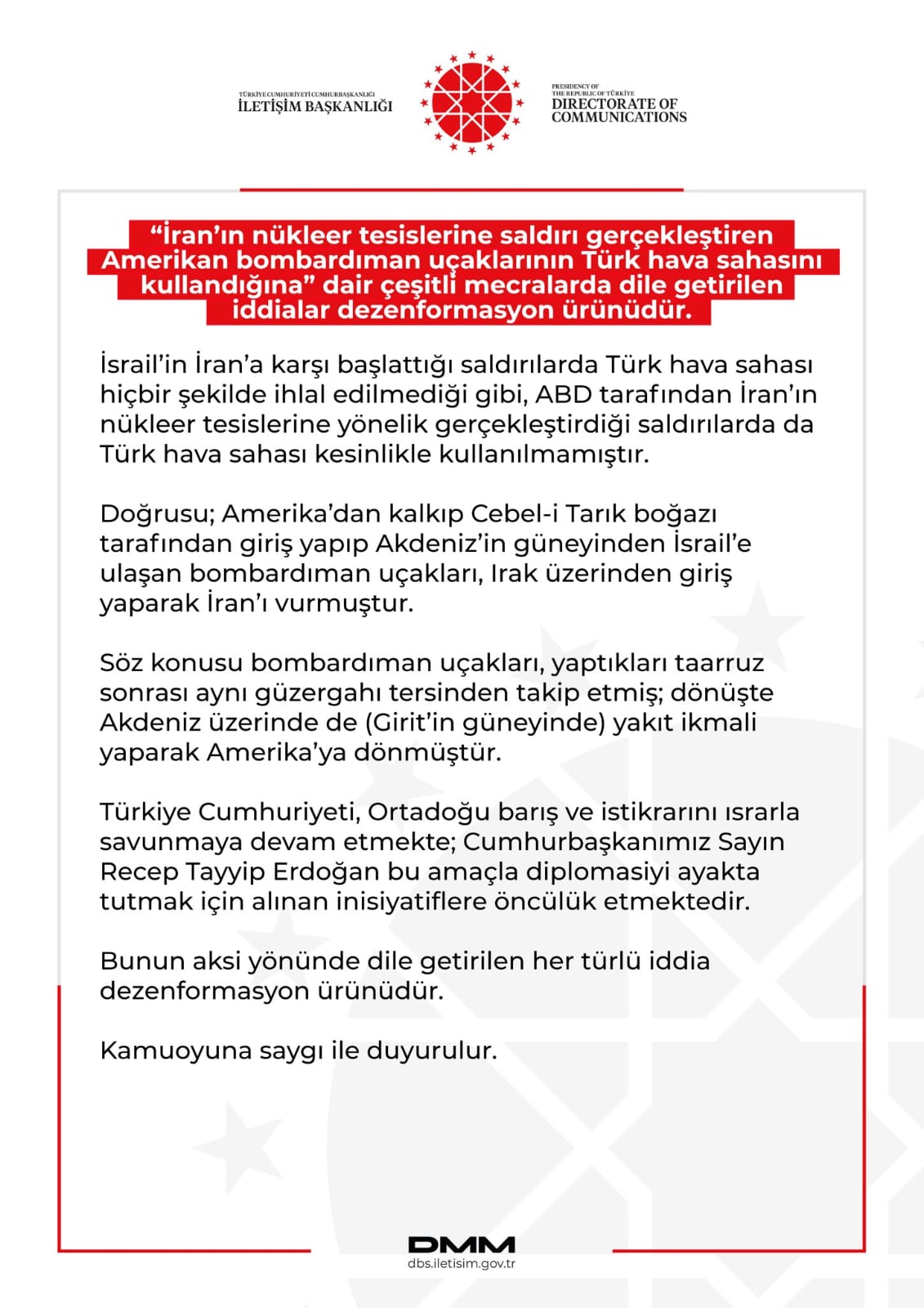İsrail’in İran’a karşı başlattığı saldırılarda Türk hava sahası hiçbir şekilde ihlal edilmediği gibi, ABD tarafından İran’ın nükleer tesislerine yönelik gerçekleştirdiği saldırılarda da Türk hava sahası kesinlikle kullanılmamıştır.