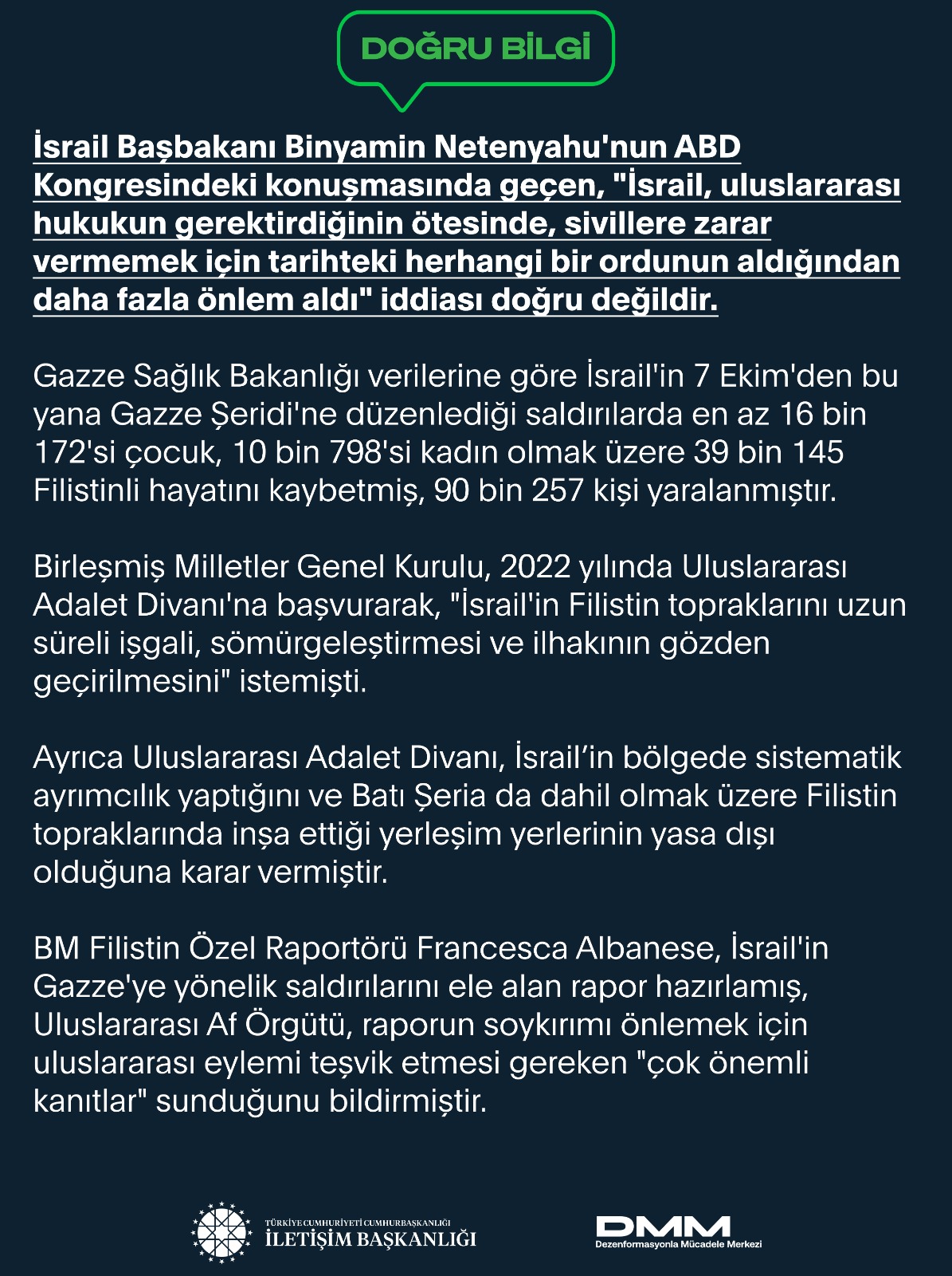 İsrail Başbakanı Binyamin Netenyahu'nun ABD Kongresindeki konuşmasında geçen, "İsrail, uluslararası hukukun gerektirdiğinin ötesinde, sivillere zarar vermemek için tarihteki herhangi bir ordunun aldığından daha fazla önlem aldı" iddiası doğru değildir.